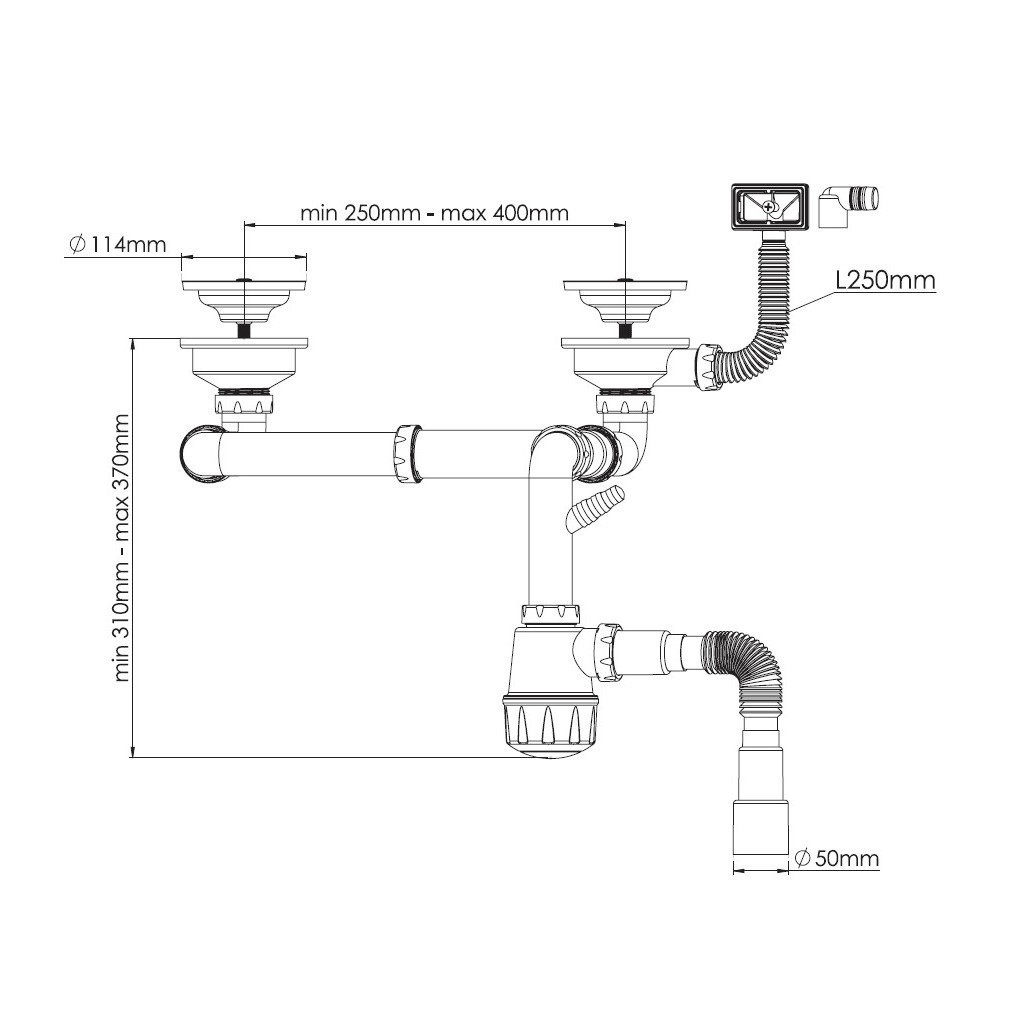 Сифон для кухонной мойки Nova NV1197, для двойной мойки, с отводом для стиральной машины