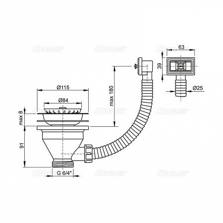 Водослив сифона для мойки 6/4" с нержавеющей решеткой Ø115 и гофропереливом, арт. A38