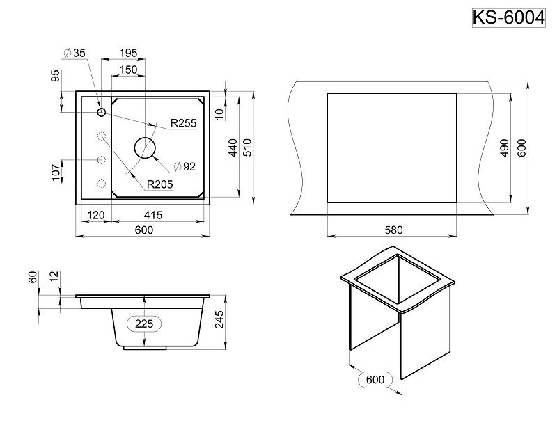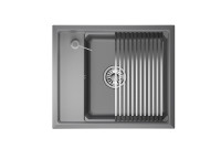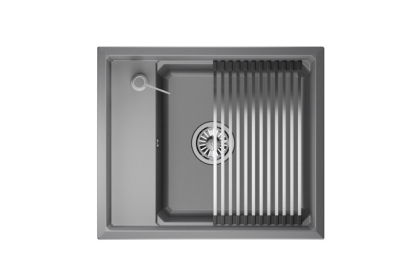 Односекционная прямоугольная мойка для установки в шкаф 600 мм с сифоном, дозатором для жидкого мыла из нержавеющей стали и ролл-матом.