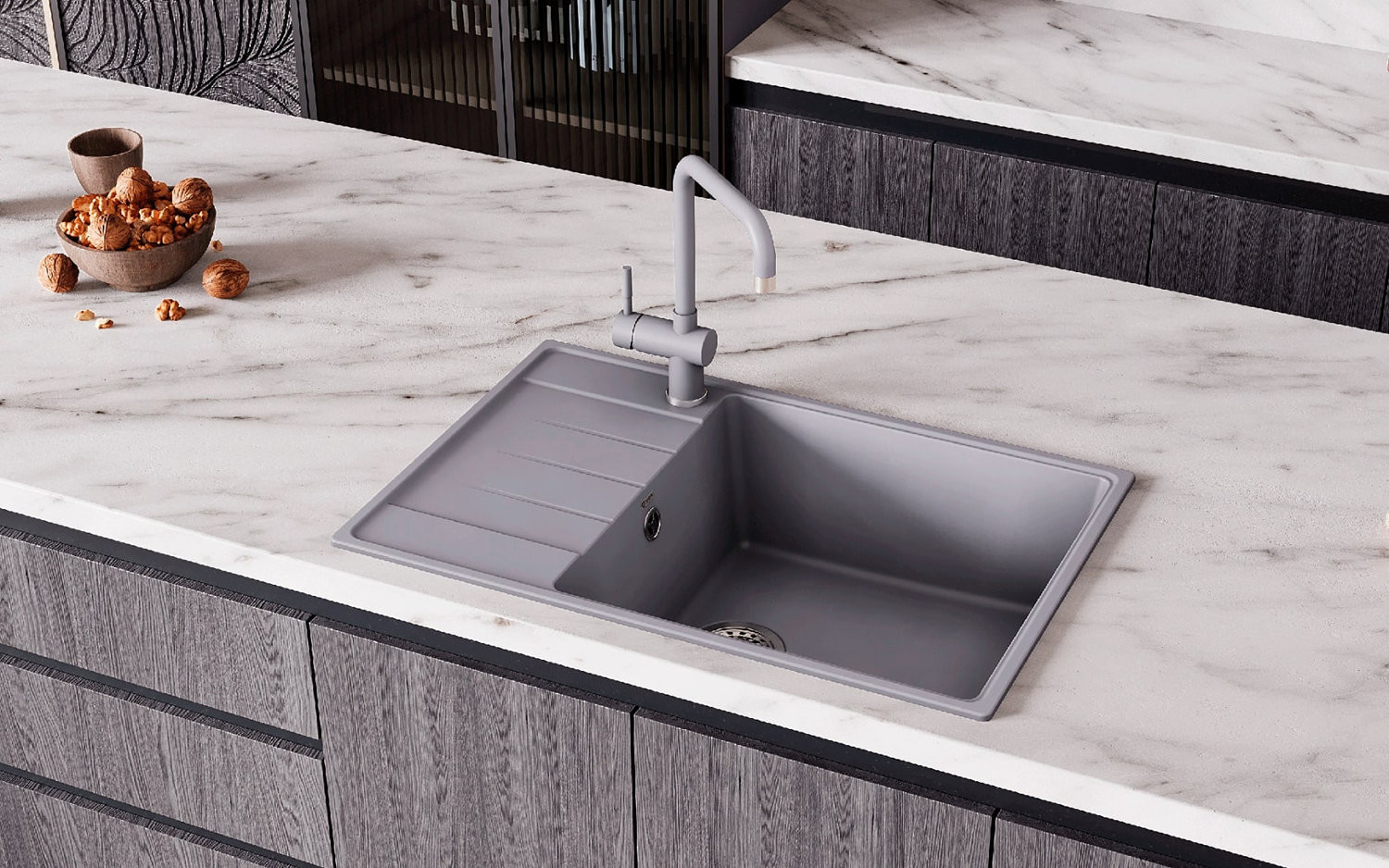 Кварцевый композит является поистине инновационным материалом в производстве кухонных моек! Он сочетает в себе такие неоспоримые преимущества как повышенная влагостойкость и термостойкость, возможность придать мойке при изготовлении практичный и функциональный дизайн, увеличенное сопротивление внешнему износу, снижение уровня шума при падении струи воды, безусловная гигиеничность и простота в уходе, а также сравнительно малый вес при высокой прочности.