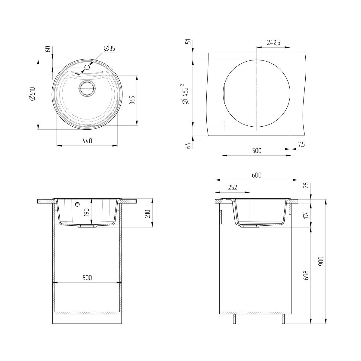 ULGRAN U-601 - классическая круглая кухонная мойка с отверстием под смеситель. Данная мойка устанавливается в шкаф шириной от 50 см. В комплектацию входит сливная арматура с гофротрубой, технический паспорт и гарантийный талон. Существует возможность установки дозатора ULGRAN слева от смесителя - доп. отверстие в таком случае потребитель делает самостоятельно с помощью фрезы Форстнера (не входит в комплектацию и приобретается отдельно). Заводская гарантия составляет 2 года, а срок службы данной мойки, при соблюдении основных правил ухода за ней, составляет более 10 лет.