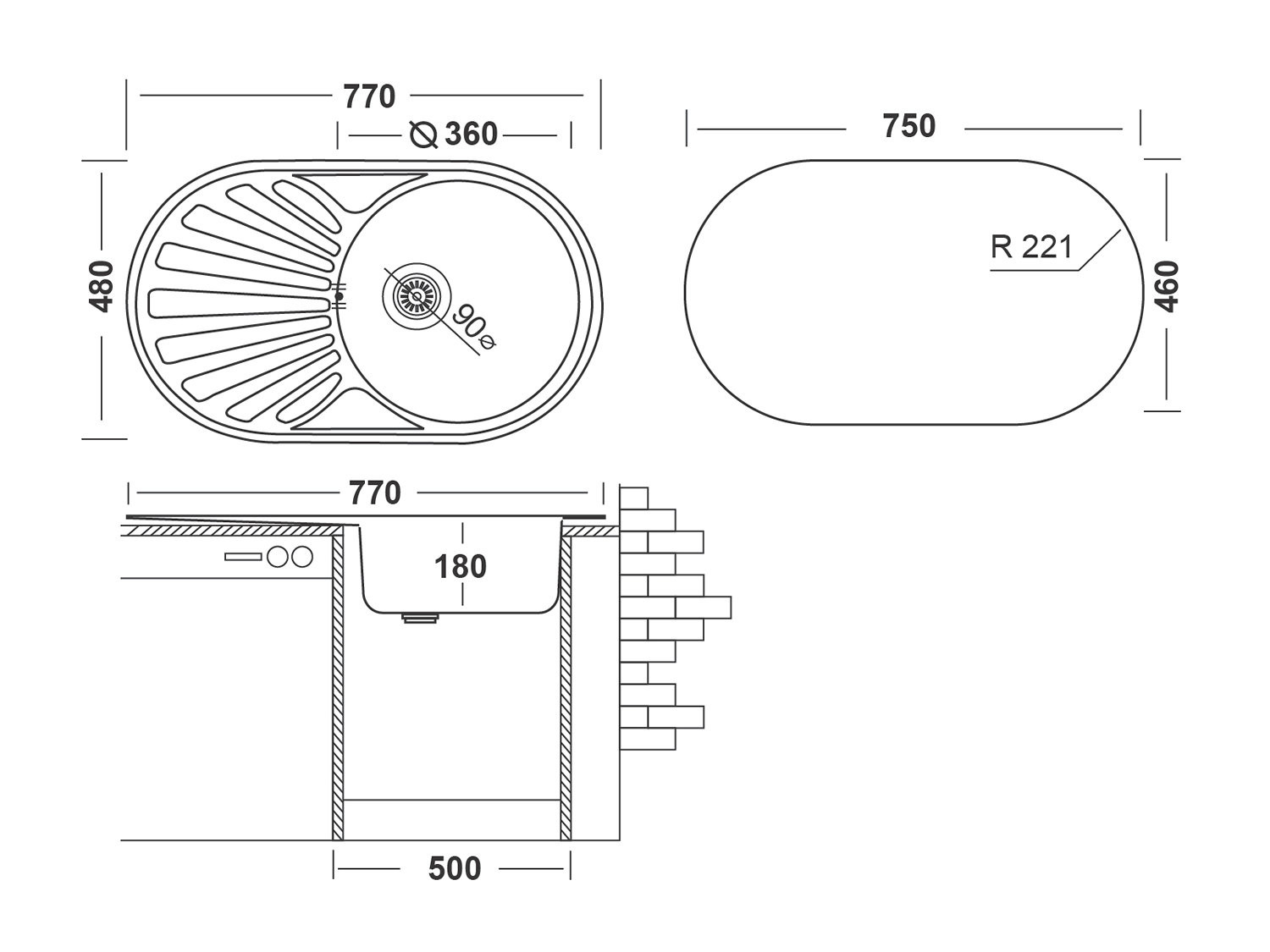 Модель врезного способа монтажа имеет размеры 770х480 мм и предназначена для установки в тумбу от 45 см.