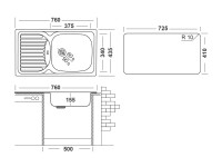 Мойка врезного способа монтажа имеет размеры 760х435 мм и предназначена для установки в тумбу от 45 см. Такая раковина идеально подойдет для небольшой кухни.