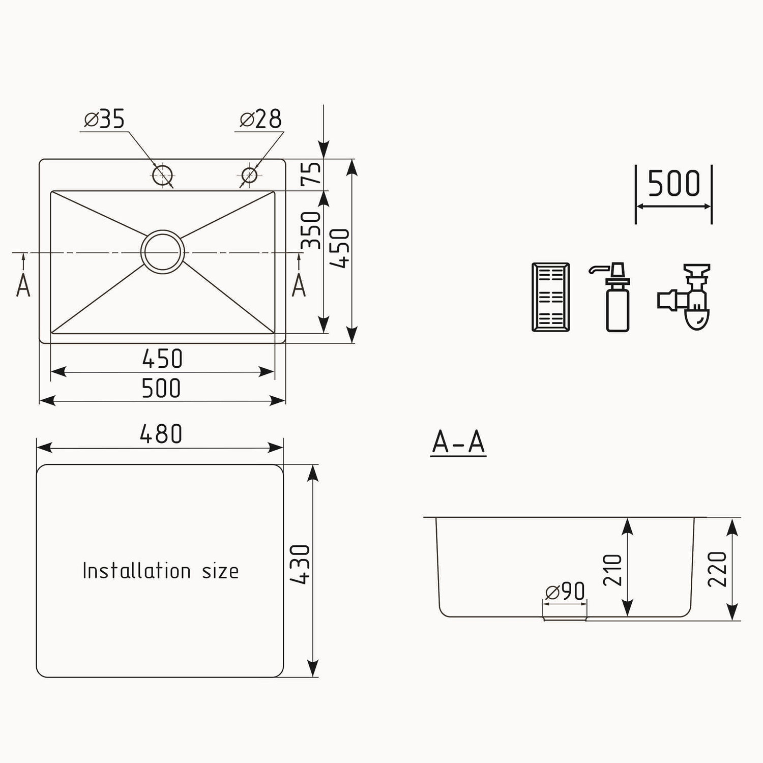 Комплектация: мойка, сливная арматура, дозатор, коландер;