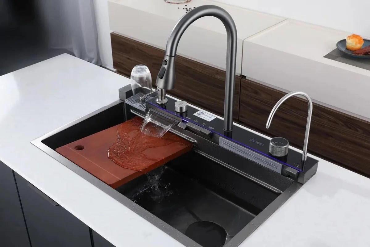 Комплектация: мойка, панель со смесителем, краном для питьевой воды ополаскивателем стакана, разделочная доска из дерева, комплект для установки;