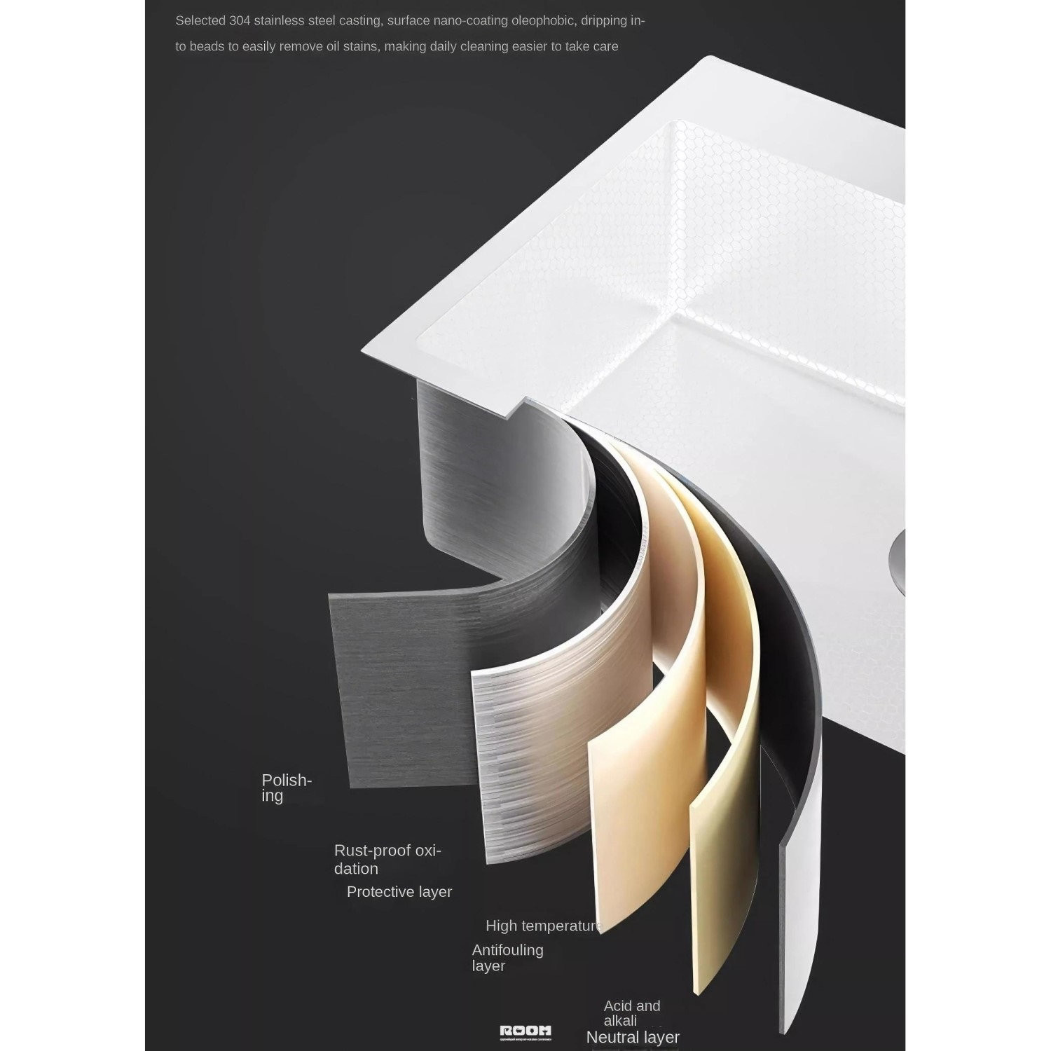 Боковой отвод воды позволяет разместить больше кухонных принадлежностей. Олеофобное покрытие позволяет легко отмывать, загрязнения и создает дополнительную антикоррозионную защиту.