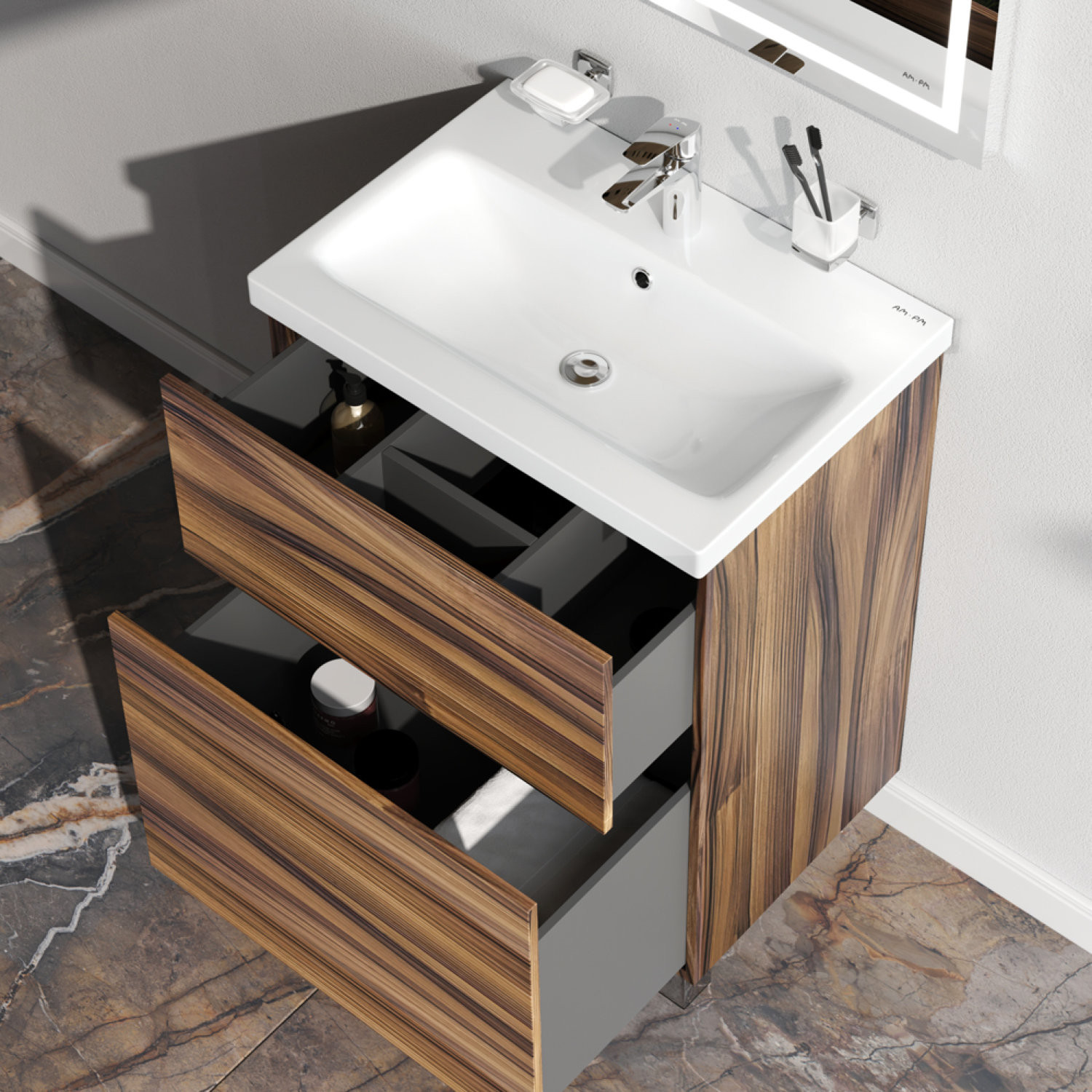 Мебель для ванной из коллекции Gem идеально подойдет тем, кто предпочитает минимализм в интерьере и выбирает абсолютный комфорт. Представляем расширение цветовой палитры коллекции Gem в цвете “орех”. Напольная база под раковину изготовлена из влагостойкого ЛДСП. Внутреннее пространство двух вместительных ящиков представлено в цвете антрацит с антискользящим эффектом. В верхнем ящике находится удобный органайзер для хранения гигиенических принадлежностей. Благодаря системе отделений органайзера, каждый предмет имеет свое место, что обеспечивает порядок и удобство при использовании. Такая система хранения позволяет экономить место и помогает поддерживать чистоту ванной комнаты Фурнитура push-to-open - открытие ящика легким нажатием на фасад. Направляющие скрытого монтажа обеспечивают плавное выдвижение ящиков. Ширина базы под раковину - 60 см. |