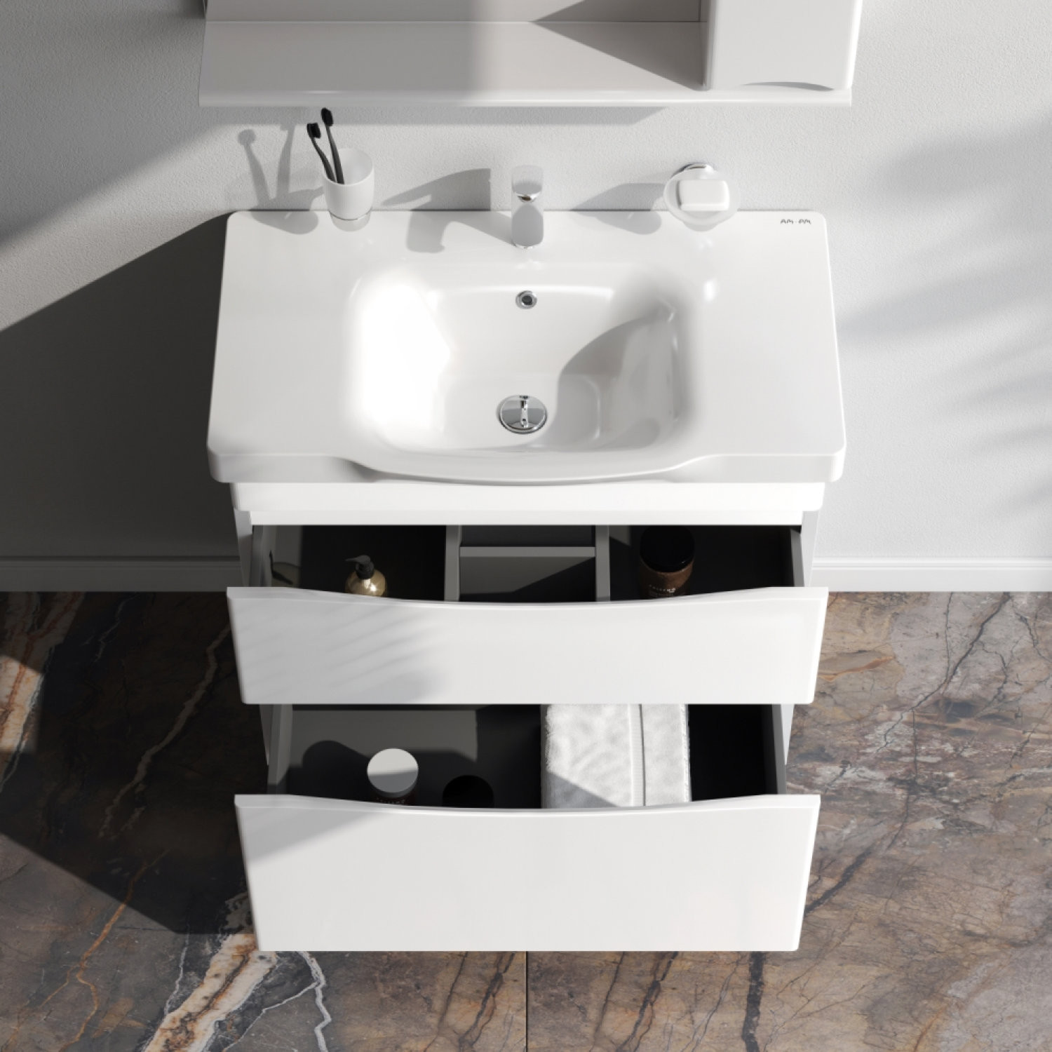 Утонченность в деталях: удобные интегрированные в фасад ручки идеально повторяют изгиб выступа раковины;
