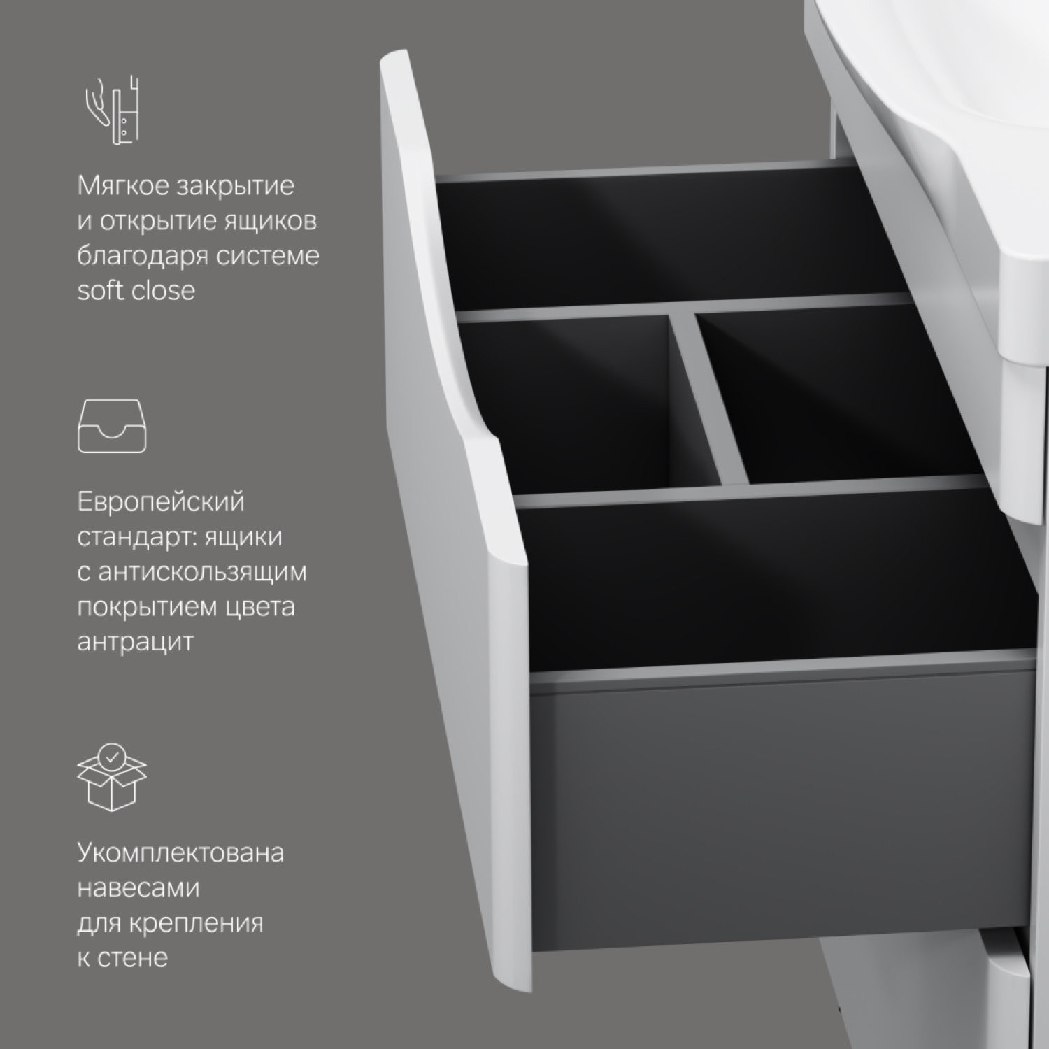 Самое мягкое открытие и закрытие ящиков в классе: направляющие скрытого монтажа с системой мягкого закрывания soft close;