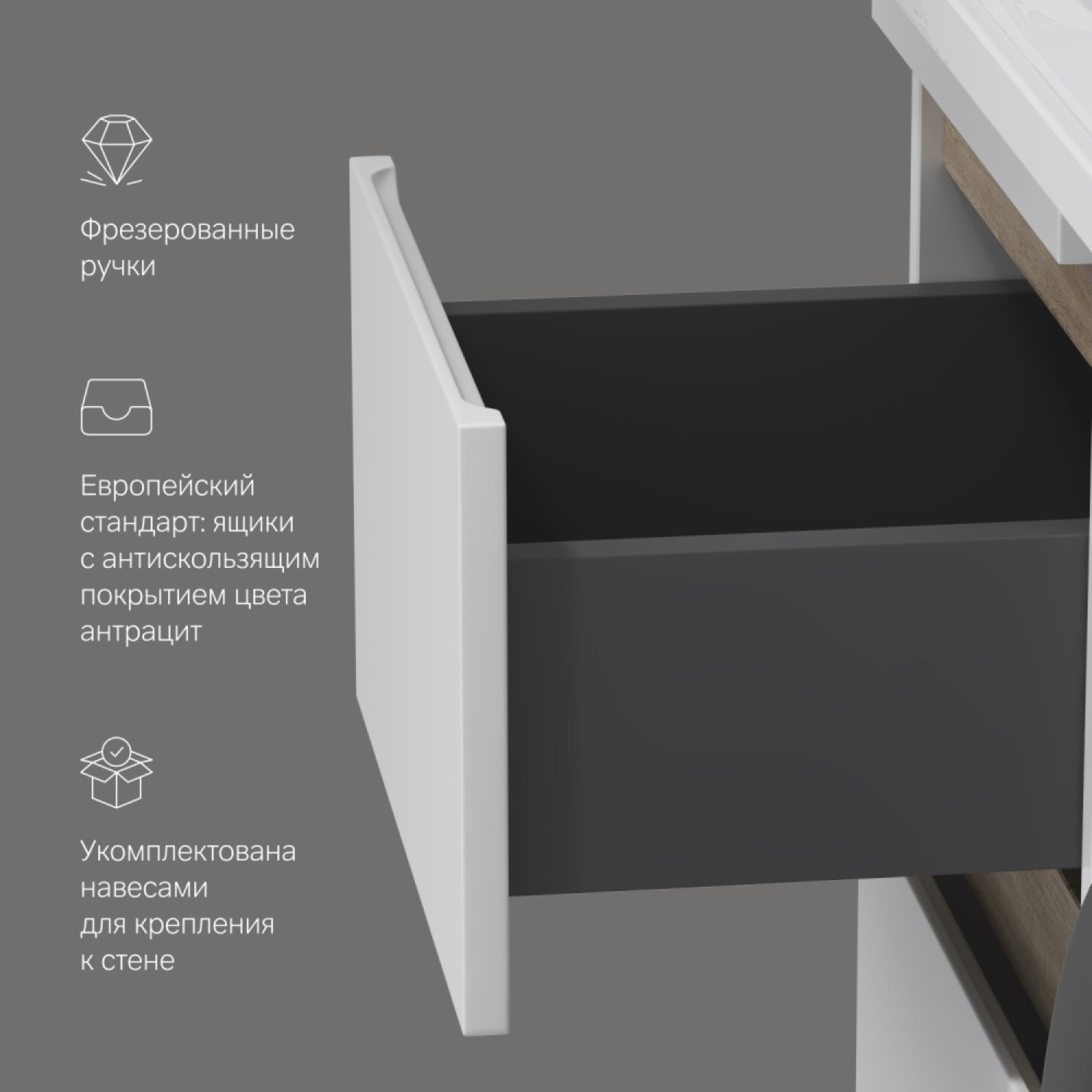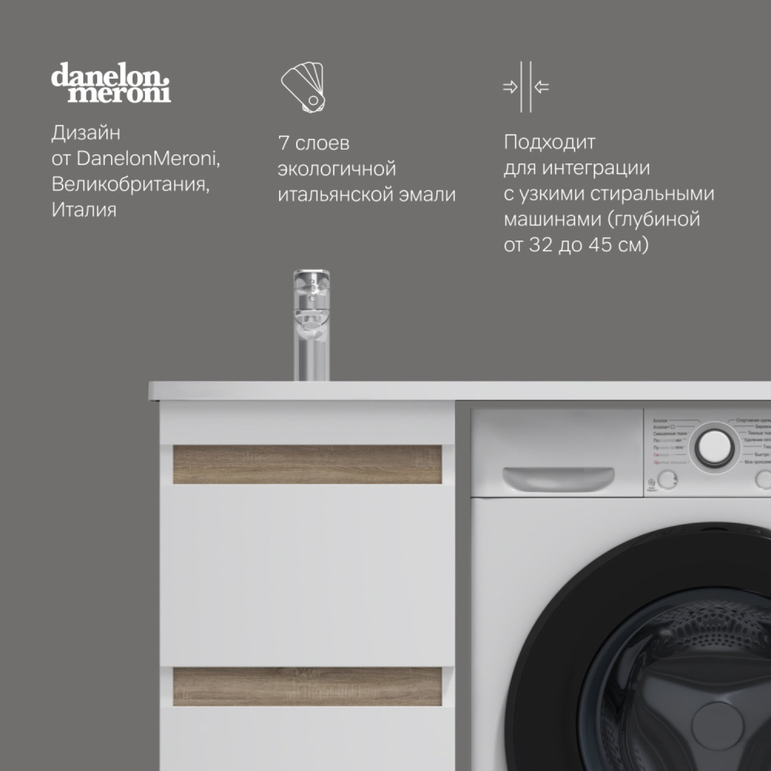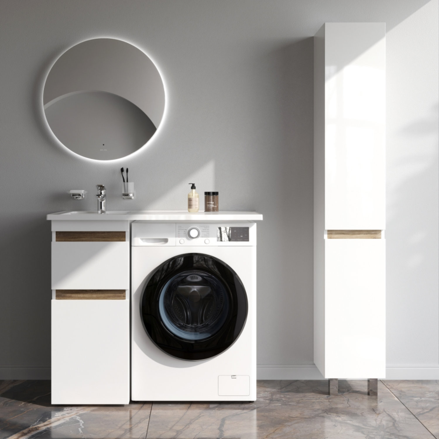 Долгожданное расширение в мебели X-Joy. Самое оптимальное и функциональное решение для организации пространства ванной комнаты с учетом размещения в ней стиральной машины. Подходит для интеграции с узкими стиральными машинами (глубиной от 32 до 45 см). Эстетичное сочетание цветов и фактур от дизайн-бюро Danelon Meroni (Великобритания & Италия): белые глянцевые фасады дополнены отделкой под светлое дерево. Глубокие, удобные ящики позволяют организовать и хранить все необходимые средства под рукой. Внутреннее покрытие каждого ящика выполнено в современном цвете Anthracite и имеет противоскользящее покрытие. Накладная раковина из литьевого мрамора белоснежного цвета оснащена съемной мыльницей, специальным бортиком для защиты от пролива воды за мебель и скрытым сливом. Экологически чистые и удивительно долговечные полиакриловые эмали – специальная технология покраски в 7 слоев превосходит технологию нанесения автоэмали у ведущих немецких марок и обеспечивает насыщенный цвет в течение всего срока службы (от 10 лет). Боковины базы выполнены из влагостойкой ЛДСП, что позволяет продлевать срок службы мебели до максимального в индустрии. База совместима с раковинами: артикулы M85AWPR1001WG; M85AWPL1001WG. Приобретаются отдельно. |