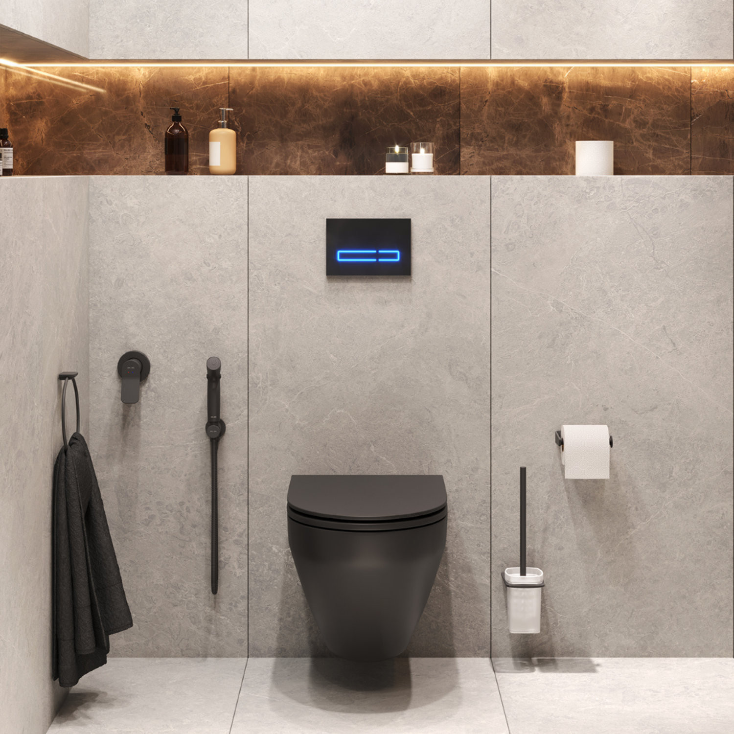 Полностью готовый к установке комплект: система инсталляции с клавишей, подвесной унитаз с сиденьем. Неразборная рама из стального профиля выдерживает нагрузку до 400 кг. Выверенный геометрический дизайн - идеально ровные поверхности и безупречно четкие грани. Дизайн этого унитаза был отмечен премиями iF Design и Good Design. Теперь и в черном матовом исполнении. Комплект включает в себя: стильный смеситель для душа, монтируемый в стену, шланговое присоединение с боковым расположением держателя для гигиенической лейки, гигиеническая лейка, душевой шланг 1 500 мм. Завершают комплект инновационные аксессуары. |
