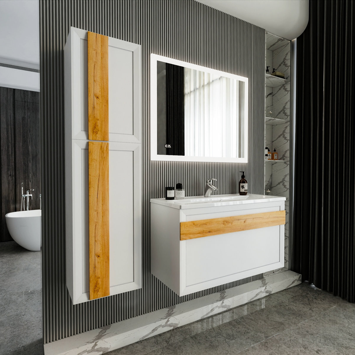 Комплект мебели Бриклаер БЕРЛИН состоит из: Тумба под раковину подвесная Бриклаер БЕРЛИН белый , 100 см, Ручка для тумбы Бриклаер БЕРЛИН 100 см, дуб золотой, Раковина Paola Mario 1000, белый, Шкаф навесной Бриклаер БЕРЛИН 60 см, белый, Шкаф навесной Бриклаер БЕРЛИН 90 см, белый, Ручка для шкафа Бриклаер БЕРЛИН 60 см, дуб золотой, Ручка для шкафа Бриклаер БЕРЛИН 90 см, дуб золотой, Зеркало Бриклаер Вега/Мальта 100 LED подсветка на взмах руки, часы.