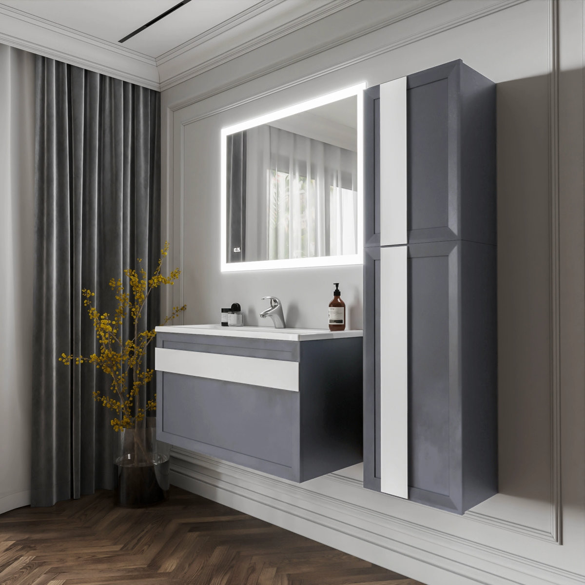 Комплект мебели Бриклаер БЕРЛИН состоит из: Тумба под раковину подвесная Бриклаер БЕРЛИН оникс серый, 100 см, Ручка для тумбы Бриклаер БЕРЛИН 100 см, белый, Раковина Paola Mario 1000, белый, Шкаф навесной Бриклаер БЕРЛИН 60 см, оникс серый, Шкаф навесной Бриклаер БЕРЛИН 90 см, оникс серый, Ручка для шкафа Бриклаер БЕРЛИН 60 см, белый, Ручка для шкафа Бриклаер БЕРЛИН 90 см, белый, Зеркало Бриклаер Вега/Мальта 100 LED подсветка на взмах руки, часы.