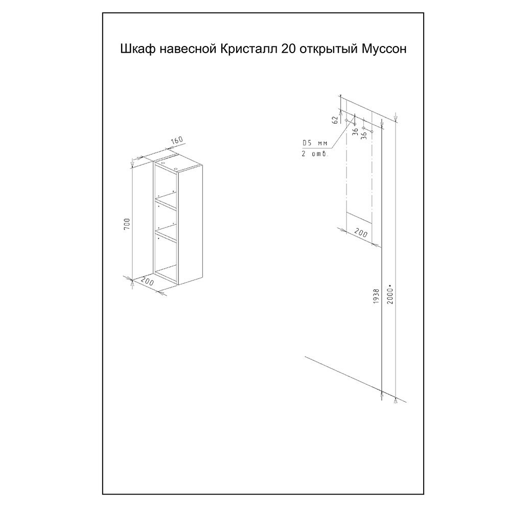 Шкаф навесной открытый Бриклаер КРИСТАЛЛ 20 см, муссон