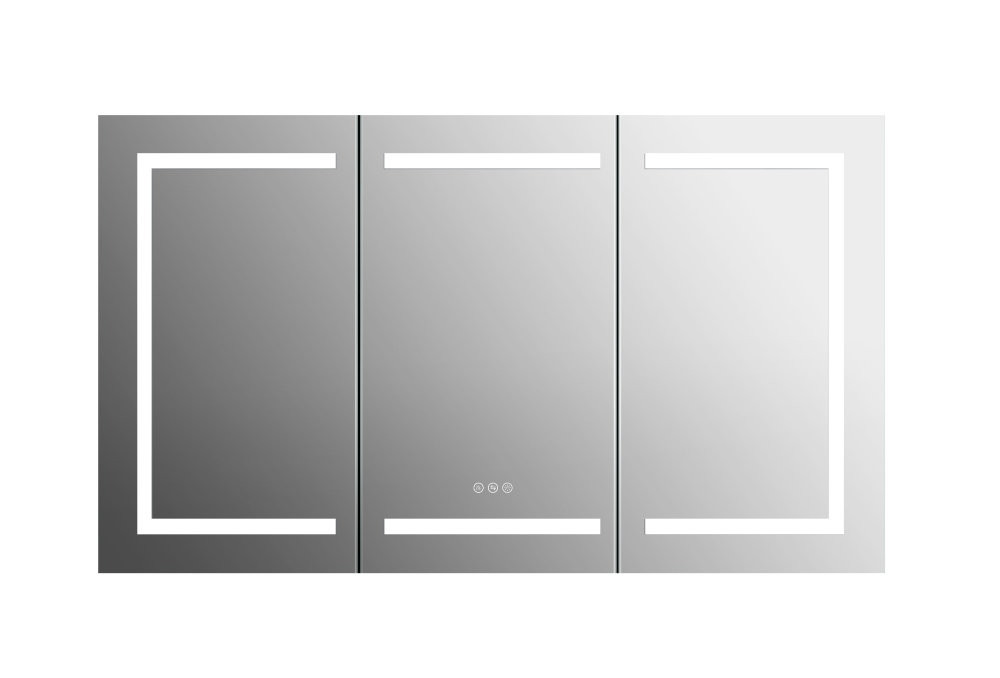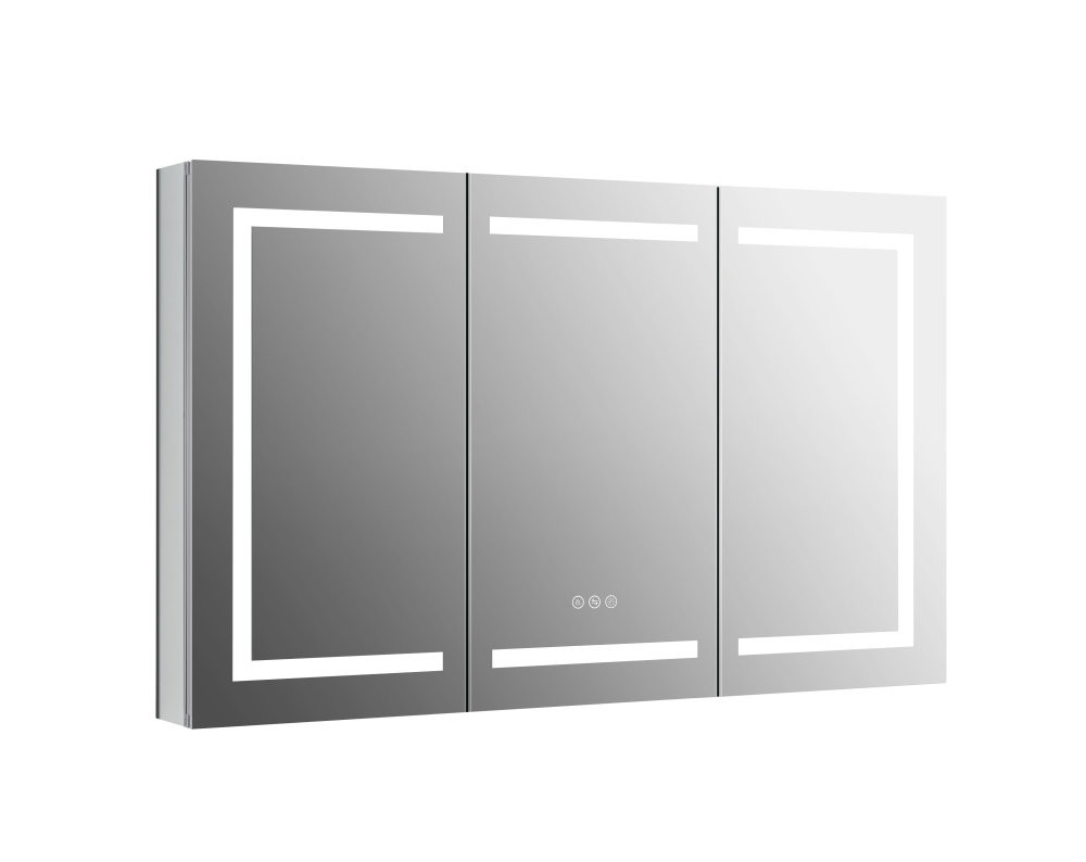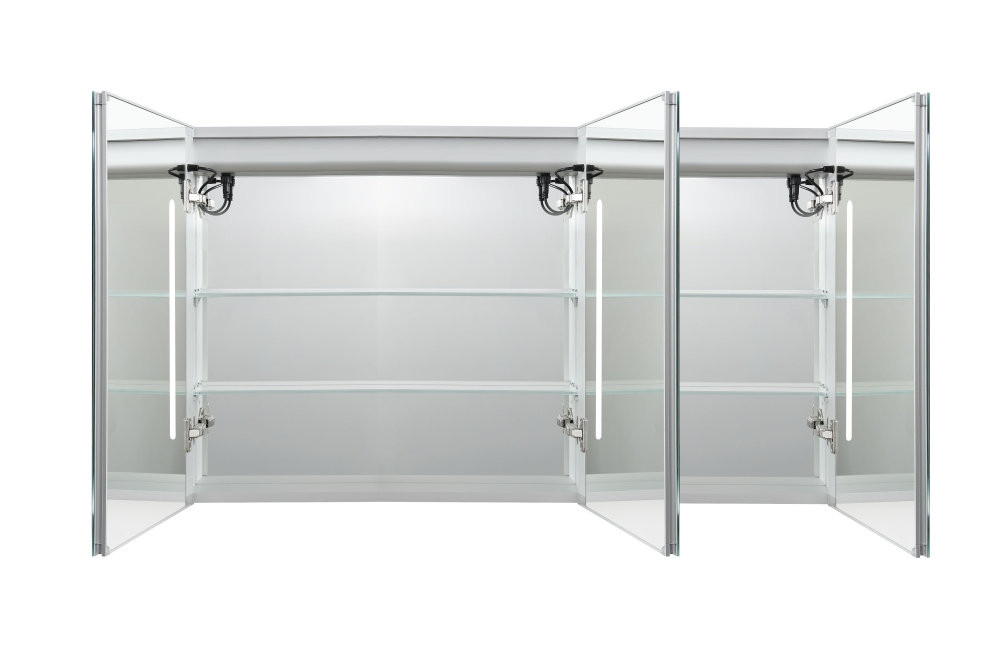 AQ7124-MLC Алюминиевый зеркальный шкаф с подсветкой 1200*700*133,крепеж.Три зерк.дверцы 39,8см, две стекл.полки, круговая подсветка, антизапотевание