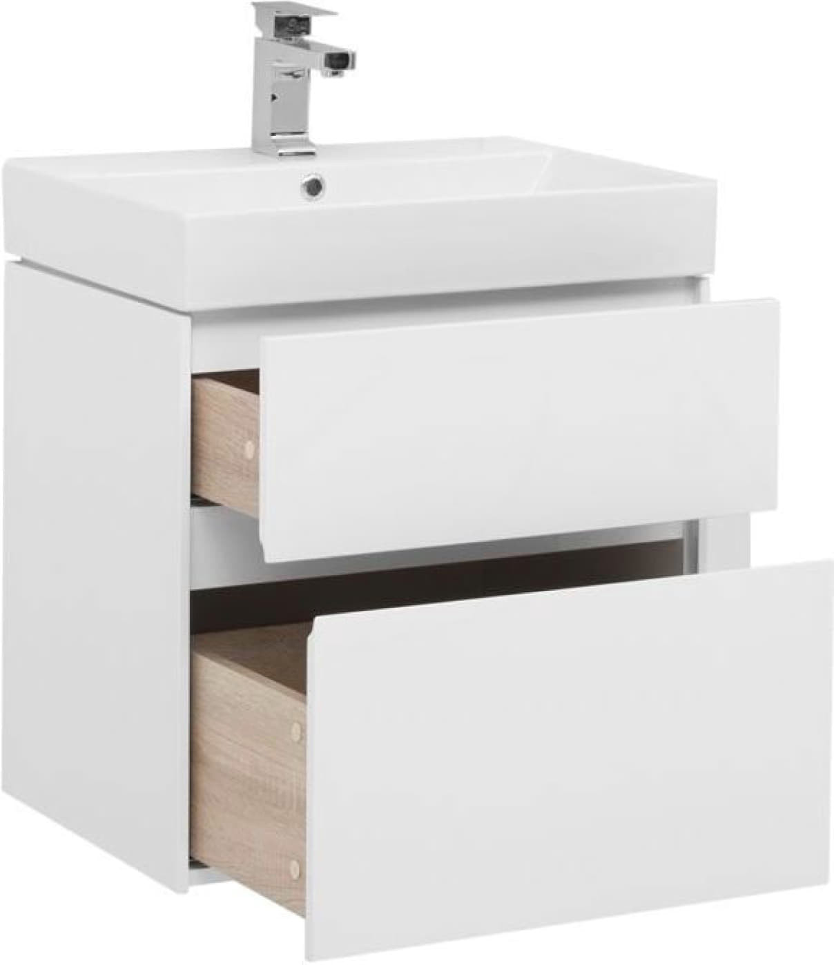 Тумба с раковиной Aquanet Бруклин 60 белого цвета предназначена для подвесной установки Изделие отвечает тенденциям минимализма Аскетизм четких линий и обтекаемых форм в ней доведен до совершенства В модели нет никаких выделяющихся деталей, и даже ручки интегрированные, когда открывание происходит за счет выступающей детали верхней или нижней части фасада, которая срезана под углом, в результате чего образуется выемка, служащая ручкой В тумбе ручка устроена таким образом у верхнего ящика в нижней части фасада, а у нижнего – в верхней Такое простое решение добавляет изысканности внешнему виду изделия Раковина из керамики с тонкими изящными бортиками идет размер в размер с тумбой, ширина которой 60 см, в результате чего все изделие выглядит как единое целое Корпус изделия выполнен из выкрашенного белой краской влагостойкого ЛДСП, фасады – из МДФ На контрасте с белизной внешних деталей стильно смотрится корпус выдвижных ящиков, выполненный в цвете «дуб сонома» Нижний ящик тумбы имеет большую зону хранения, верхний разделен на несколько отделений, которые помогут грамотно разложить все необходимое по своим местам