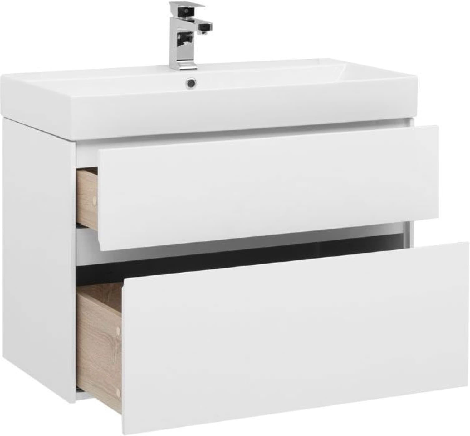 Тумба с раковиной Aquanet Бруклин 85 белого цвета предназначена для подвесной установки Изделие отвечает тенденциям минимализма Аскетизм четких линий и обтекаемых форм в ней доведен до совершенства В модели нет никаких выделяющихся деталей, и даже ручки интегрированные, когда открывание происходит за счет выступающей детали верхней или нижней части фасада, которая срезана под углом, в результате чего образуется выемка, служащая ручкой В тумбе ручка устроена таким образом у верхнего ящика в нижней части фасада, а у нижнего – в верхней Такое простое решение добавляет изысканности внешнему виду изделия Раковина из керамики с тонкими изящными бортиками идет размер в размер с тумбой, ширина которой 85 см, в результате чего все изделие выглядит как единое целое Корпус изделия выполнен из выкрашенного белой краской влагостойкого ЛДСП, фасады – из МДФ На контрасте с белизной внешних деталей стильно смотрится корпус выдвижных ящиков, выполненный в цвете «дуб сонома» Нижний ящик тумбы имеет большую зону хранения, верхний разделен на несколько отделений, которые помогут грамотно разложить все необходимое по своим местам