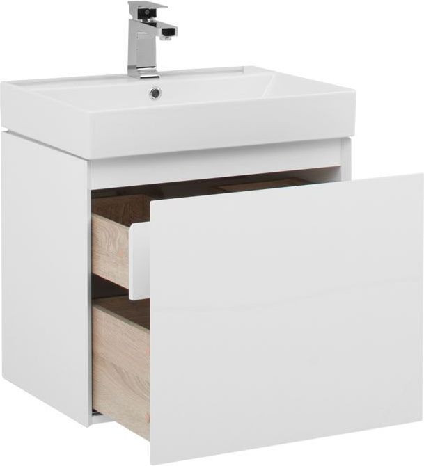 Тумба с раковиной Aquanet Йорк 60 кажется довольно-таки простой внешне, но за видимой простотой кроется тщательная работа над каждой линией, над каждой деталью. Обратите внимание на интегрированную ручку, которой по сути не видно, но при открывании выдвижного ящика она поражает удобством использования. Радует глаз зеркальная чистота глянцевой поверхности фасада из МДФ. Мебель белоснежная. Цветовой акцент появляется при выдвижении ящика тумбы, так как внутренние детали сделаны в цвете «дуб сонома». Сочетание выглядит благородно и эстетично, при этом не изменяя общей идее лаконичности во всем. Ящик в тумбочке один, но внутри него прячется еще одна зона хранения, в которой можно разложить по местам разнообразные мелочи. В системе выдвижения использована фурнитура немецкого производителя Hettich. Тумба шириной 60 см комплектуется керамической раковиной Sanovit. Она может быть как подвесной, так и напольной – на выбор покупателя. <
