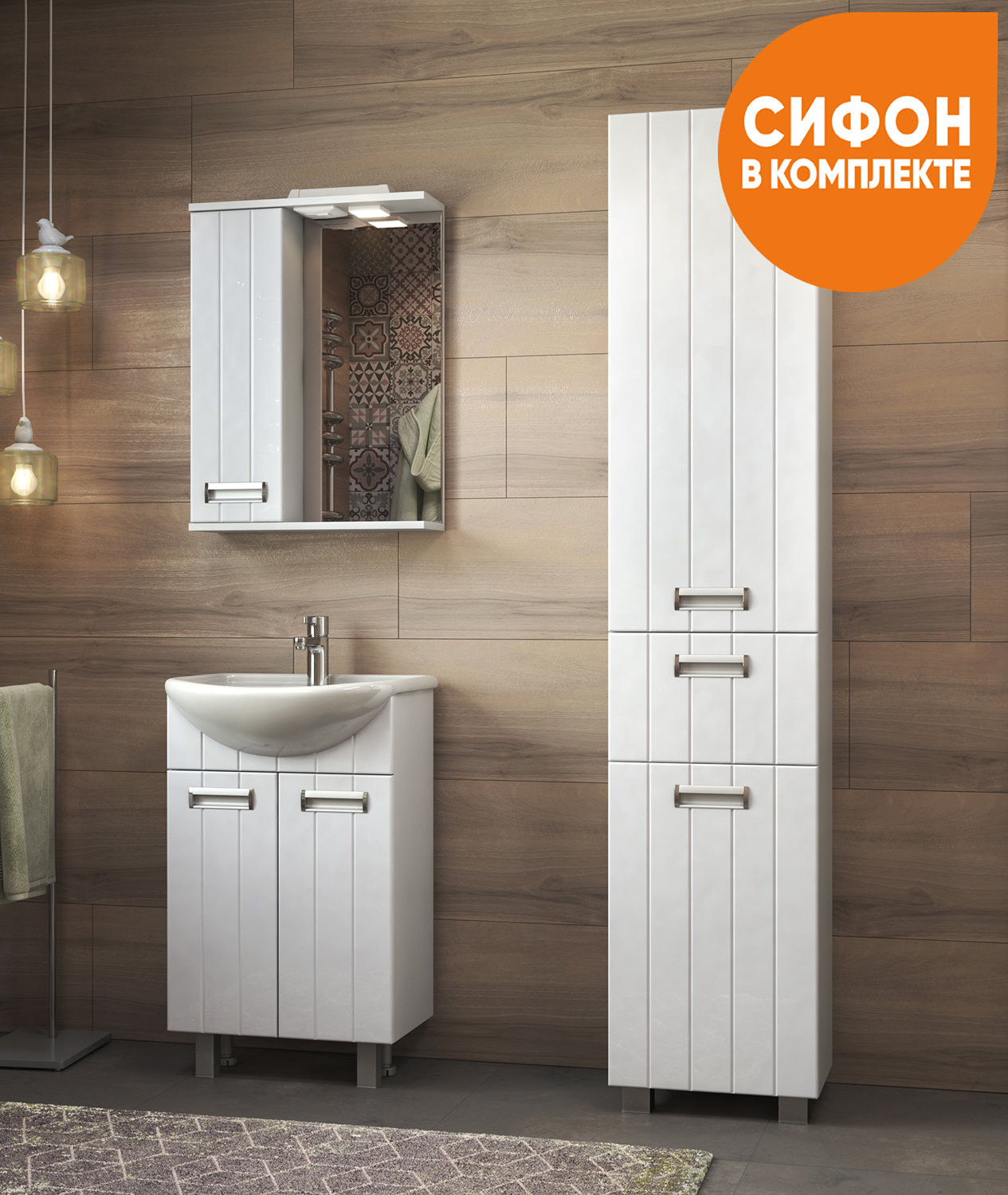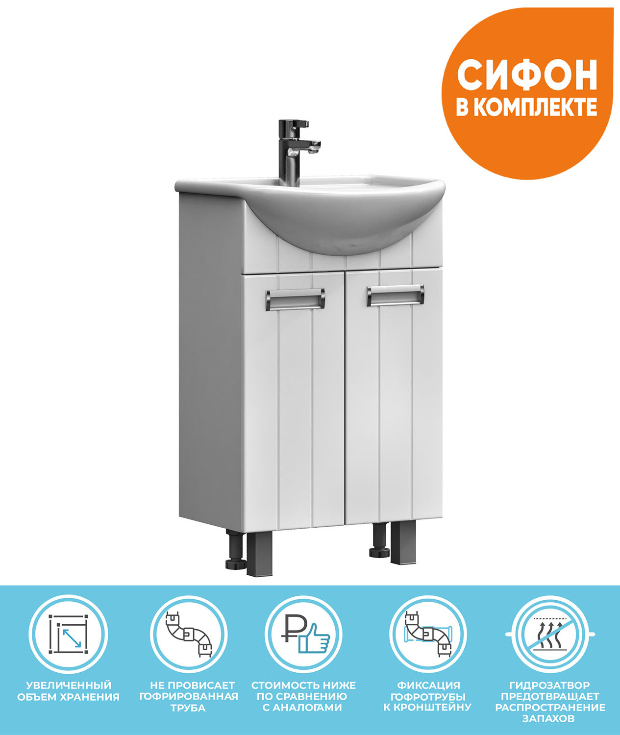 2 дверцы; 1 полка ЛДСП; ручка врезная металлическая хромированная, опоры квадратные регулируемые. Специальный сифон Vigo в комплекте. Материал корпуса: влагостойкая ЛДСП Материал фасадов: ЛМДФ Покрытие: пленка ПВХ Дверцы: петли с механизмом плавного закрывания