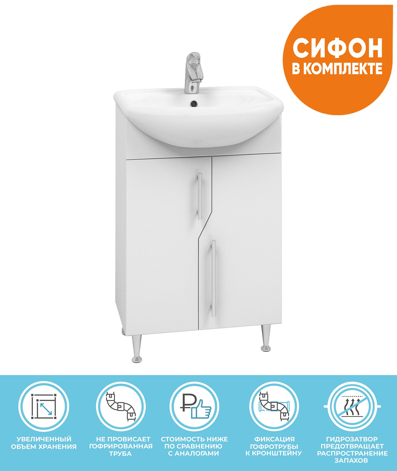 2 дверцы; 1 полка ЛДСП; опоры конус регулируемые. Специальный сифон Vigo в комплекте. Материал корпуса: влагостойкая ЛДСП Материал фасадов: ЛМДФ Покрытие: пленка ПВХ.