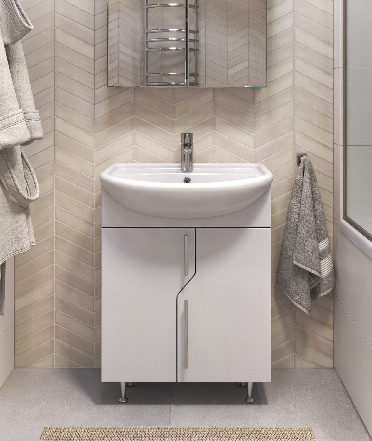 2 дверцы; 1 полка ЛДСП; опоры конус регулируемые. Специальный сифон Vigo в комплекте. Материал корпуса: влагостойкая ЛДСП Материал фасадов: ЛМДФ Покрытие: пленка ПВХ.