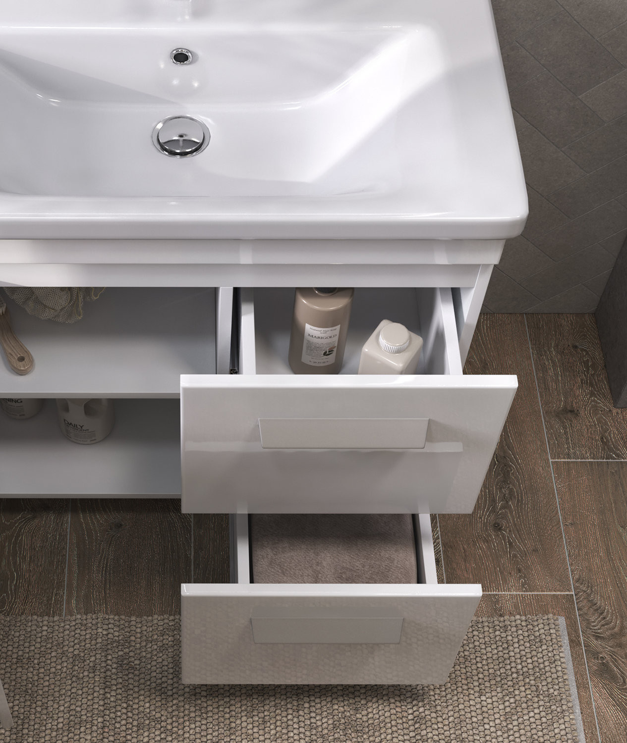 1 дверца; 2 выдвижных ящика; ручка пластиковая матовый хром; опоры квадратные регулируемые. Материал корпуса: влагостойкая ЛДСП. Материал фасадов: ЛМДФ Покрытие: пленка ПВХ Ящики: направляющие полного выдвижения