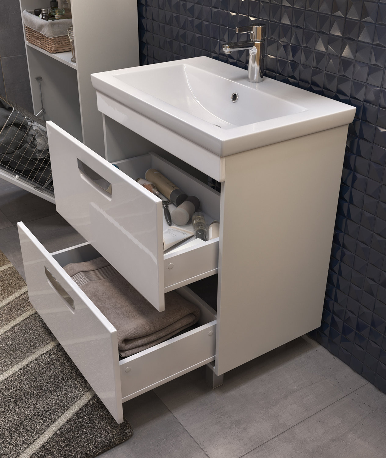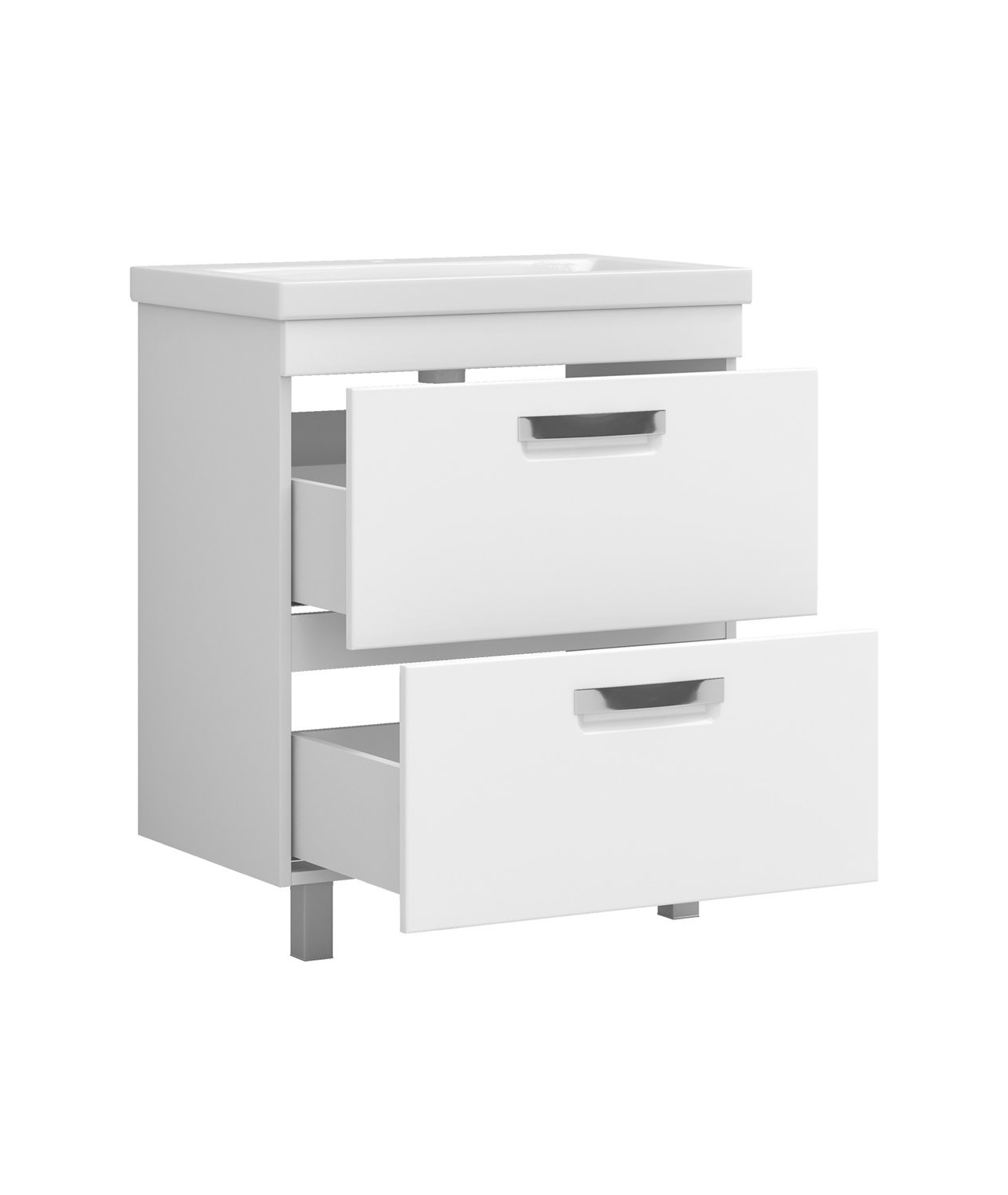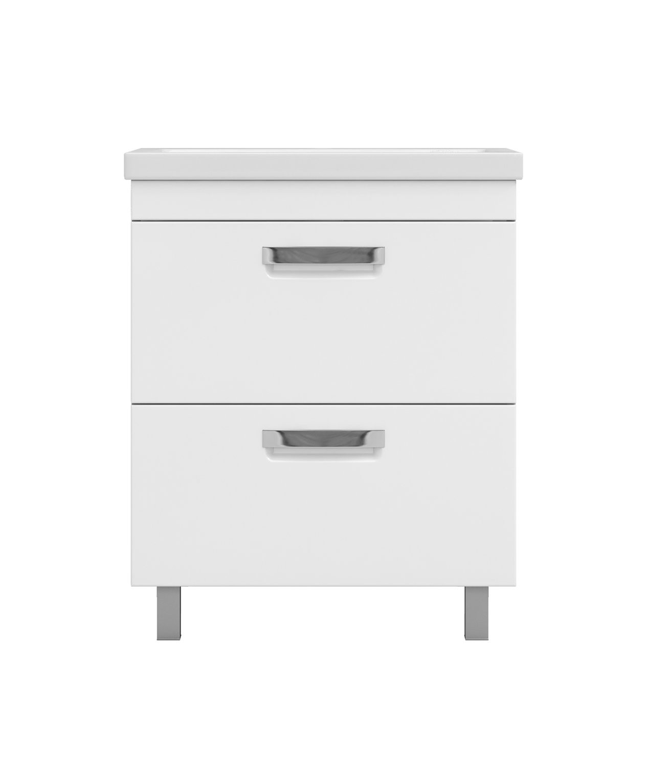 2 ящика; ручка врезная металлическая хромированная, опоры квадратные регулируемые. Материал корпуса: влагостойкая ЛДСП Материал фасадов: ЛМДФ Покрытие: пленка ПВХ Ящики: скрытые направляющие полного выдвижения, механизм мягкого бесшумного самозакрывания. (Hettich,Германия)