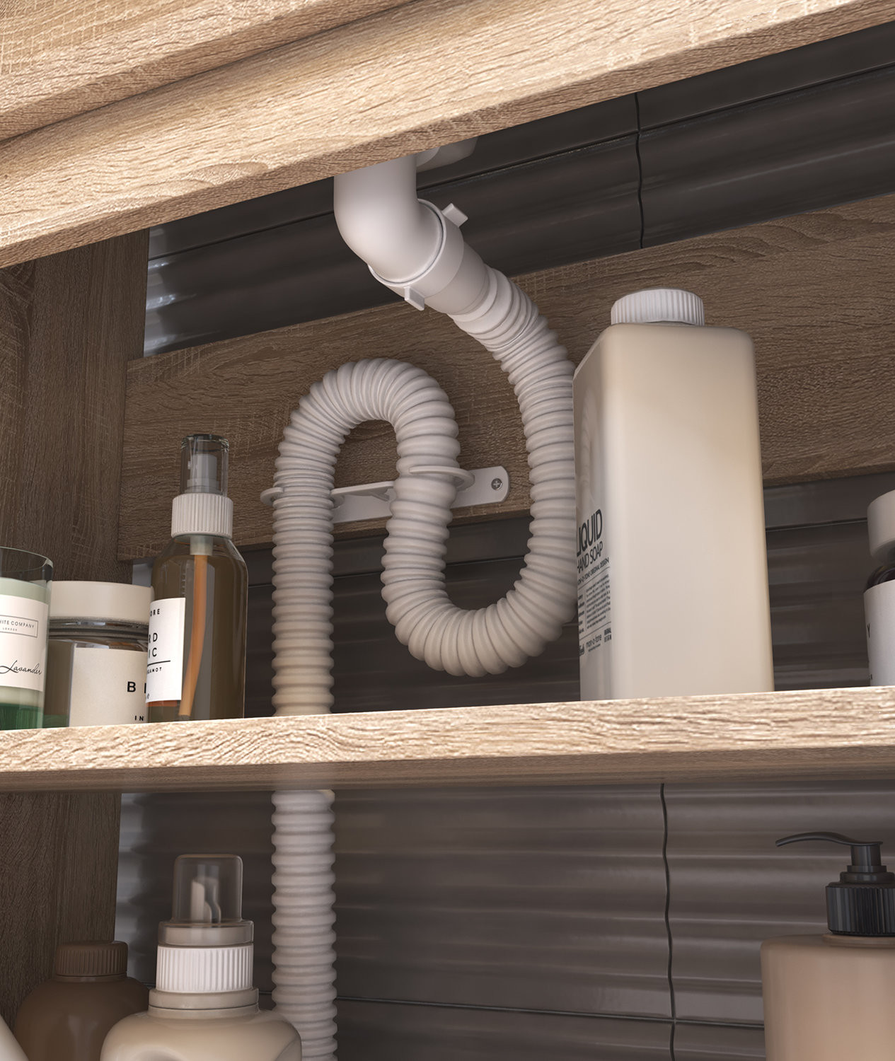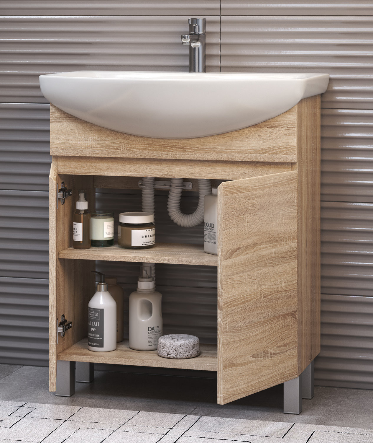 2 дверцы, 1 полка ЛДСП, опоры регулируемые квадратные. Специальный сифон Vigo в комплекте. Материал корпуса и фасада: влагостойкая ЛДСП Дверцы: петли с механизмом плавного закрывания Отсутствие лицевой фурнитуры – интегрированная в фасад ручка