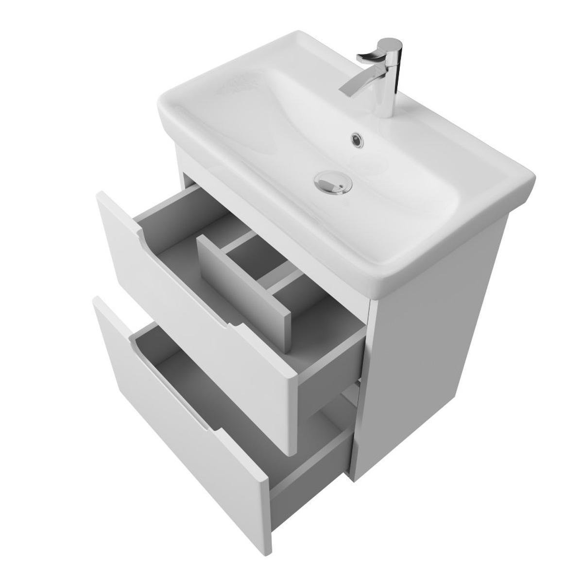 Тумба под раковину подвесная Dreja Q 60 см, белый. Фурнитура: Hettich. Компоновка: 2 ящика. Дополнительные функции: встроенный органайзер в верхнем ящике. Монтаж: подвесной.