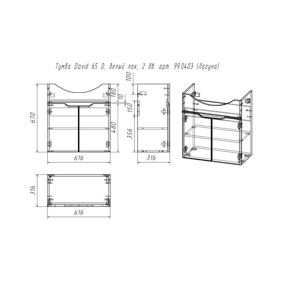 Тумба под раковину подвесная/напольная Dreja David D 65 см, белый. Фурнитура: Hettich. Компоновка: 2 дверцы. Монтаж: подвесной/напольный. Возможен напольный монтаж - необходимо отдельно приобрести ножки Dreja арт.: 99.9811.
