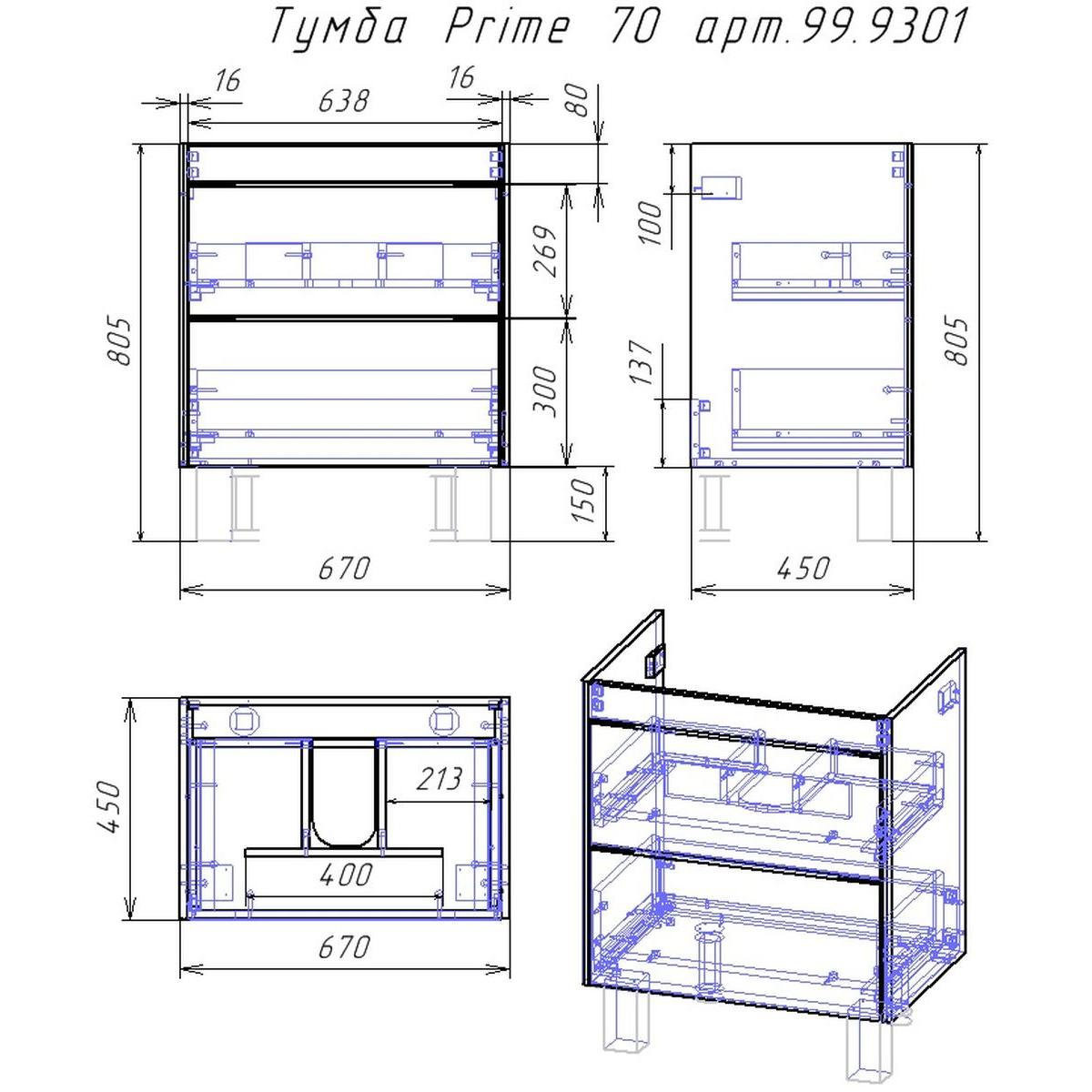 Тумба под раковину подвесная/напольная Dreja Prime 70 см, белый. Фурнитура: Hettich. Компоновка: 2 ящика. Дополнительные функции: встроенный органайзер в верхнем ящике. Монтаж: подвесной/напольный. Возможен напольный монтаж - необходимо отдельно приобрести ножки Dreja арт.: 99.9811