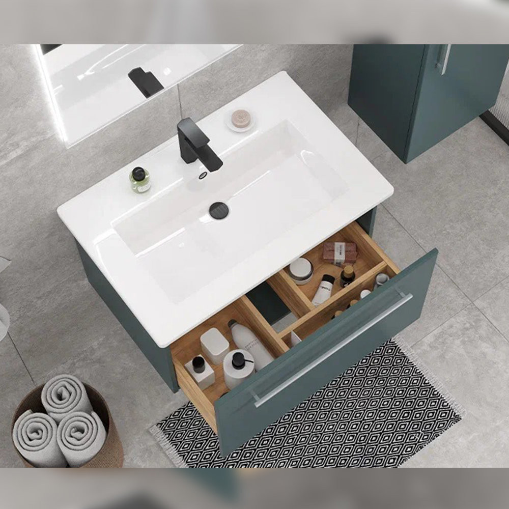 Тумба под раковину подвесная Velvex Posse tp.POS.OSK.75.1Y верде/дуб золотой, 75 см: 1 выдвижной ящик с механизмом плавного закрывания.