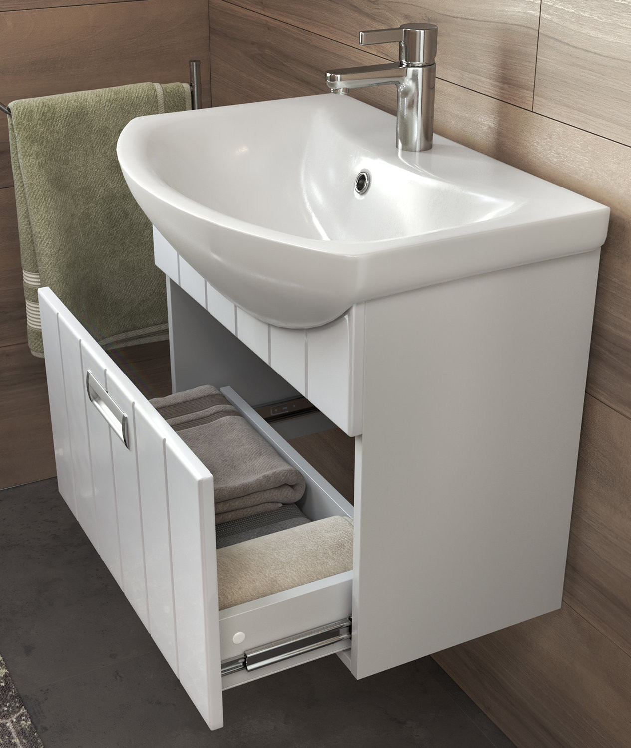 Тумба подвесная, 1 вестительный выдвижной ящик; ручка врезная металлическая хромированная. Специальный сифон Vigo в комплекте. Материал корпуса: влагостойкая ЛДСП Материал фасадов: ЛМДФ Покрытие: пленка ПВХ Ящики: направляющие полного выдвижения.