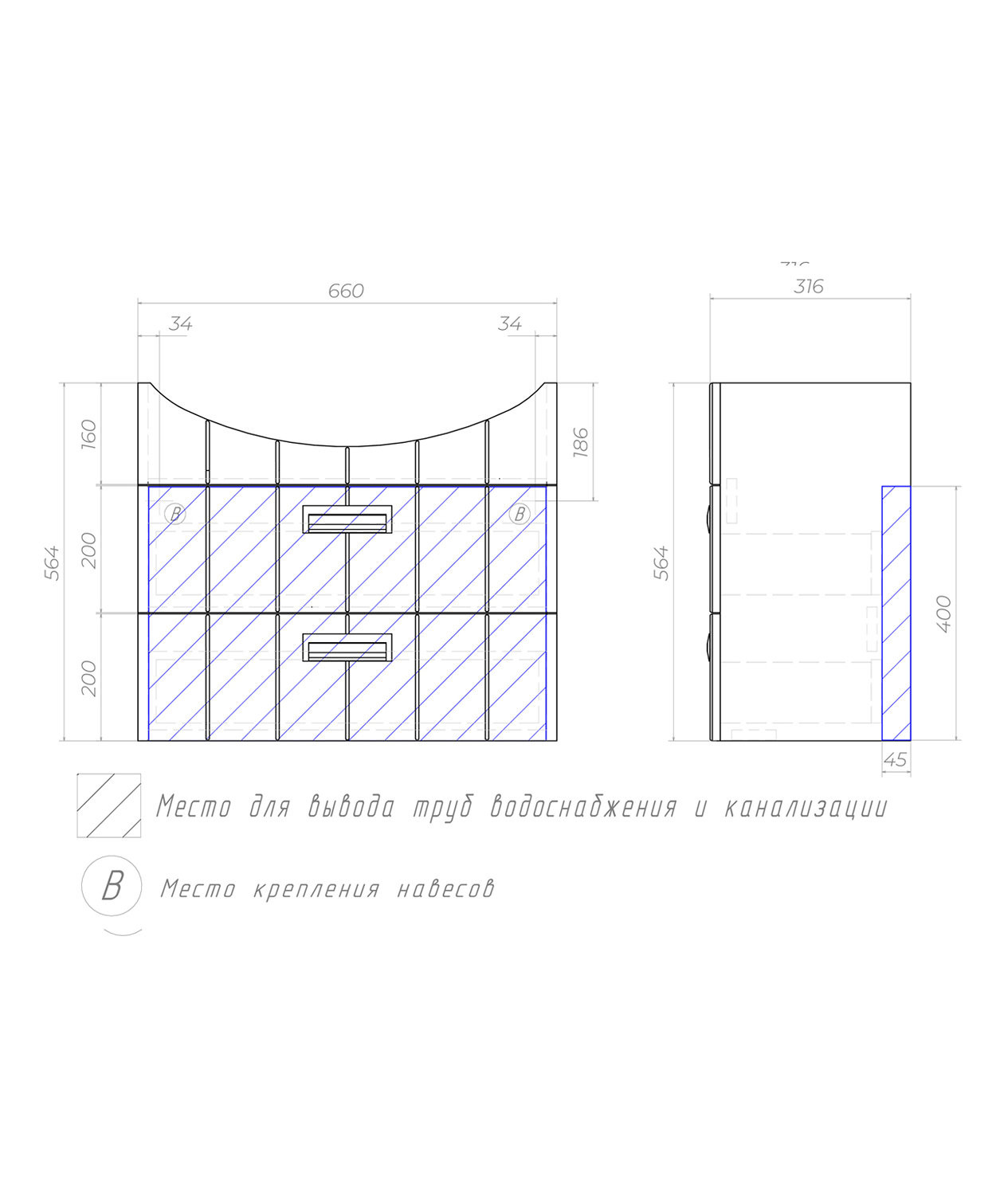 Тумба подвесная, 2 выдвижных ящика; ручка врезная металлическая хромированная. Специальный сифон Vigo в комплекте. Материал корпуса: влагостойкая ЛДСП Материал фасадов: ЛМДФ Покрытие: пленка ПВХ Ящики: направляющие полного выдвижения.