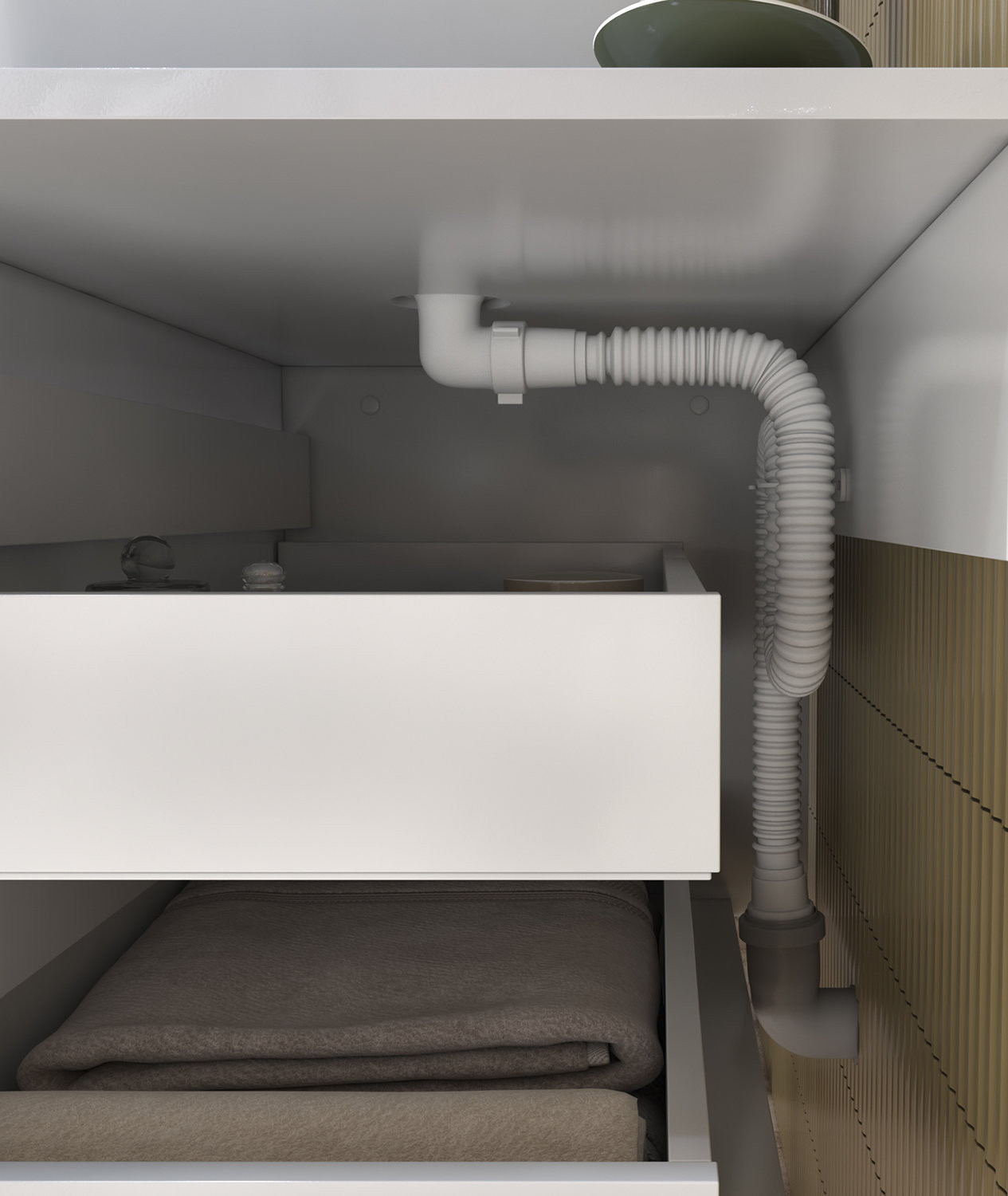 2 ящика. Специальный сифон Vigo в комплекте. Материал корпуса: влагостойкая ЛДСП Материал фасада: ЛМДФ Покрытие фасада: пленка ПВХ Ящики: направляющие полного выдвижения Отсутствие лицевой фурнитуры – интегрированная в фасад ручка