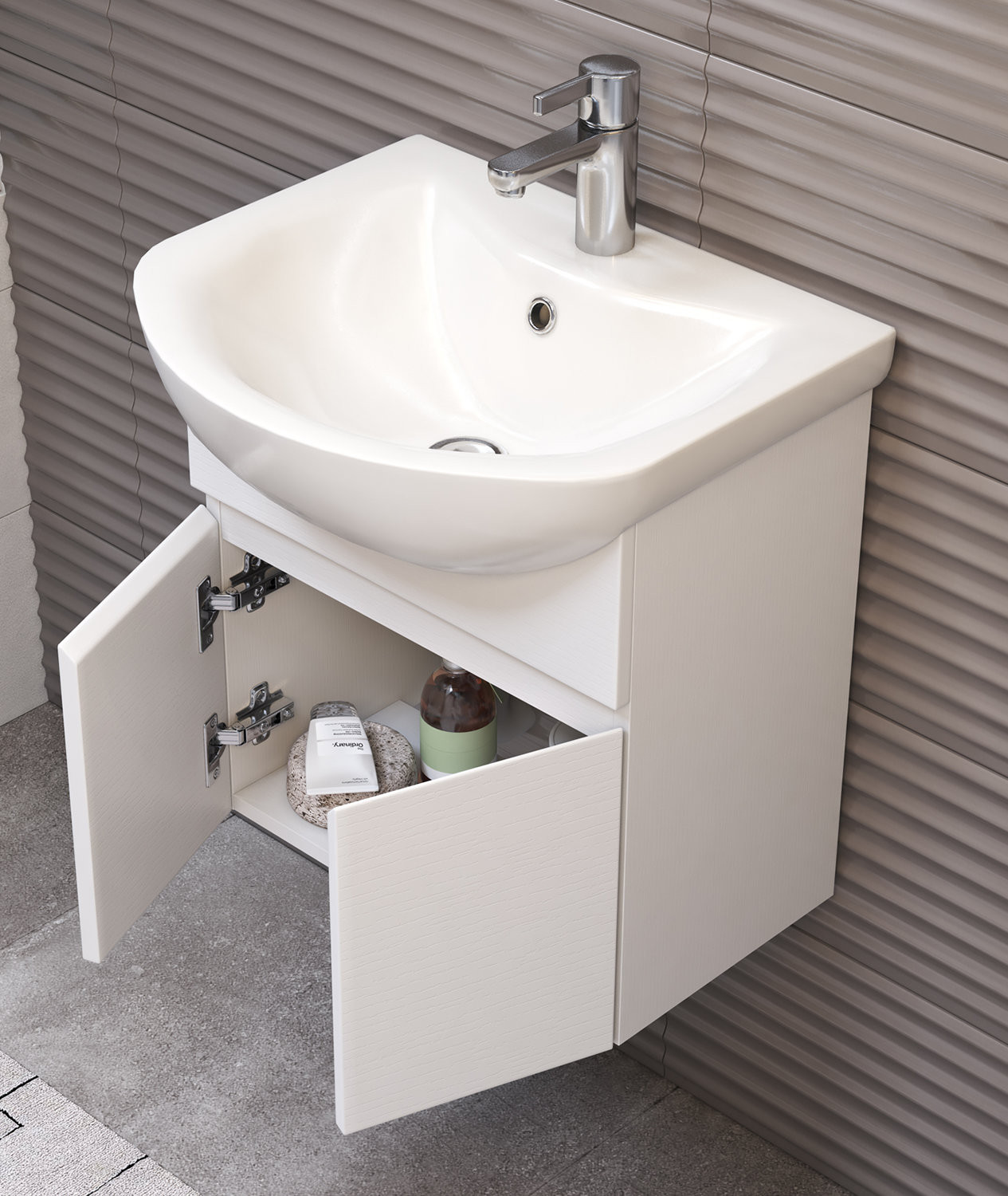 2 дверцы. Специальный сифон Vigo в комплекте. Материал корпуса и фасада: влагостойкая ЛДСП Дверцы: петли с механизмом плавного закрывания Отсутствие лицевой фурнитуры – интегрированная в фасад ручка