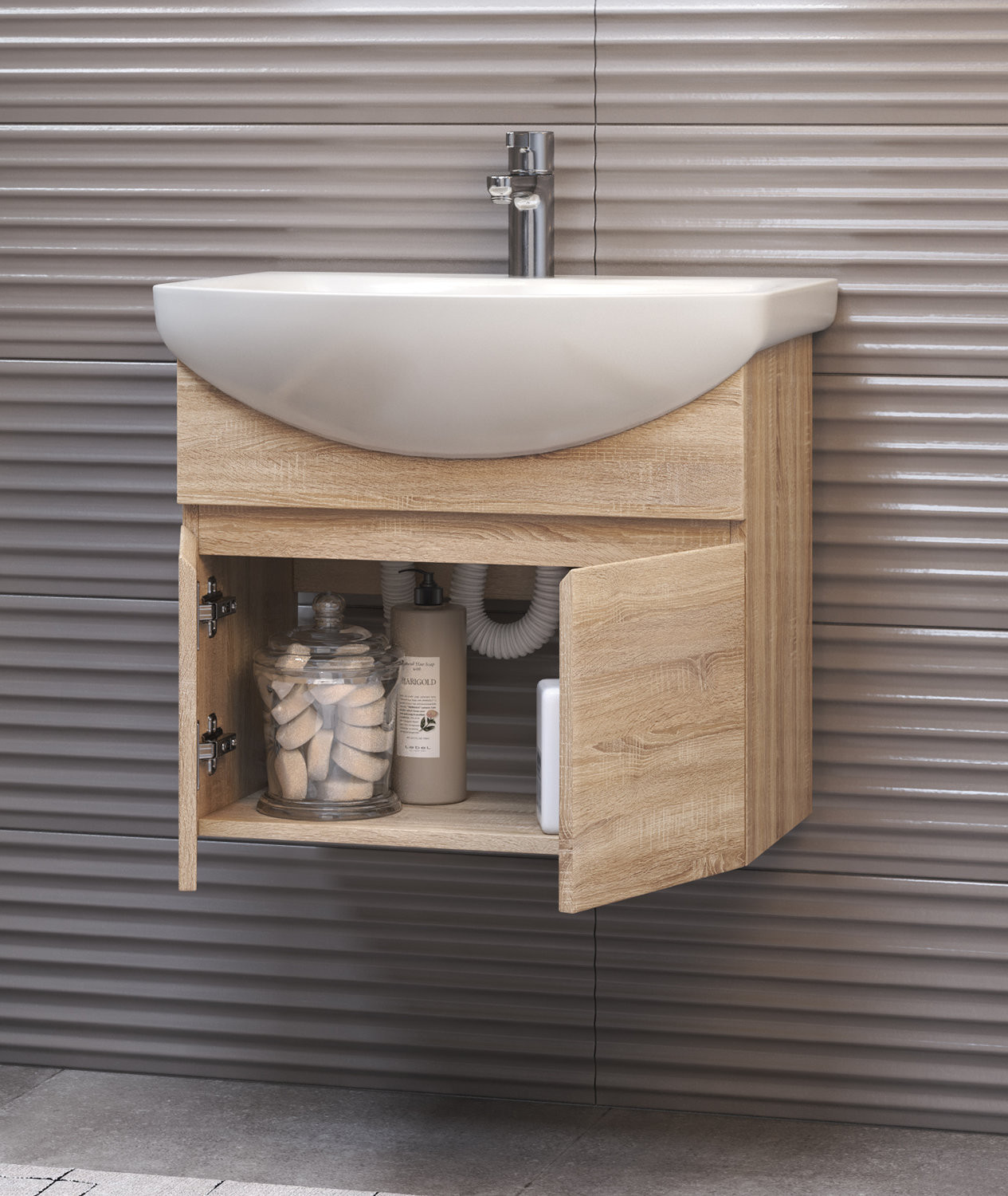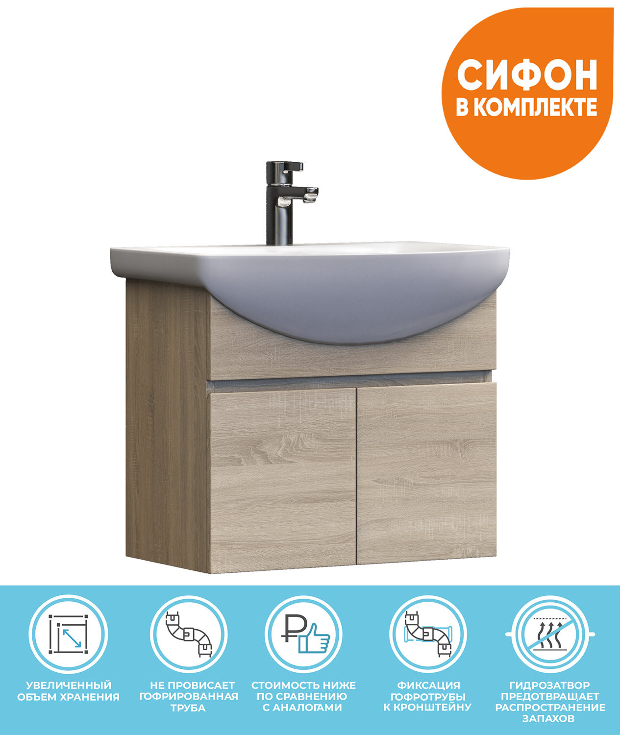 2 дверцы. Специальный сифон Vigo в комплекте. Материал корпуса и фасада: влагостойкая ЛДСП Дверцы: петли с механизмом плавного закрывания Отсутствие лицевой фурнитуры – интегрированная в фасад ручка