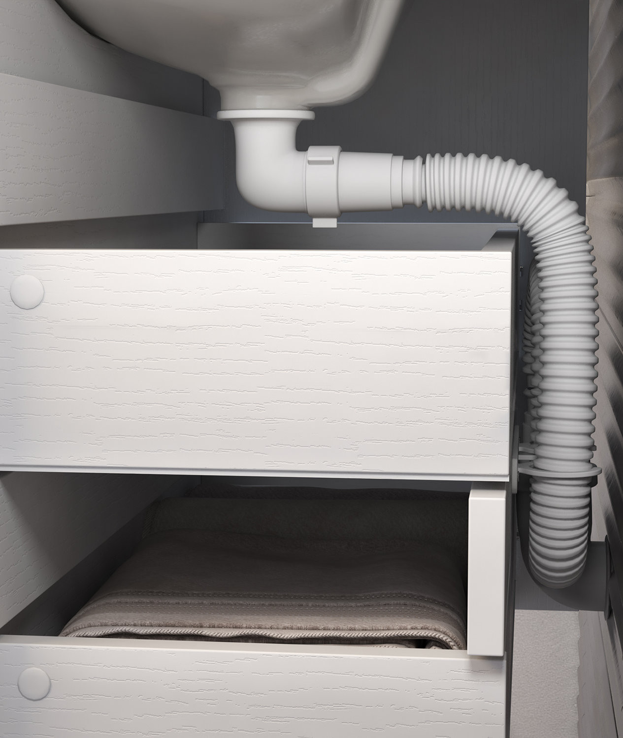 2 ящика. Специальный сифон Vigo в комплекте. Материал корпуса и фасада: влагостойкая ЛДСП Ящики: направляющие полного выдвижения Отсутствие лицевой фурнитуры – интегрированная в фасад ручка