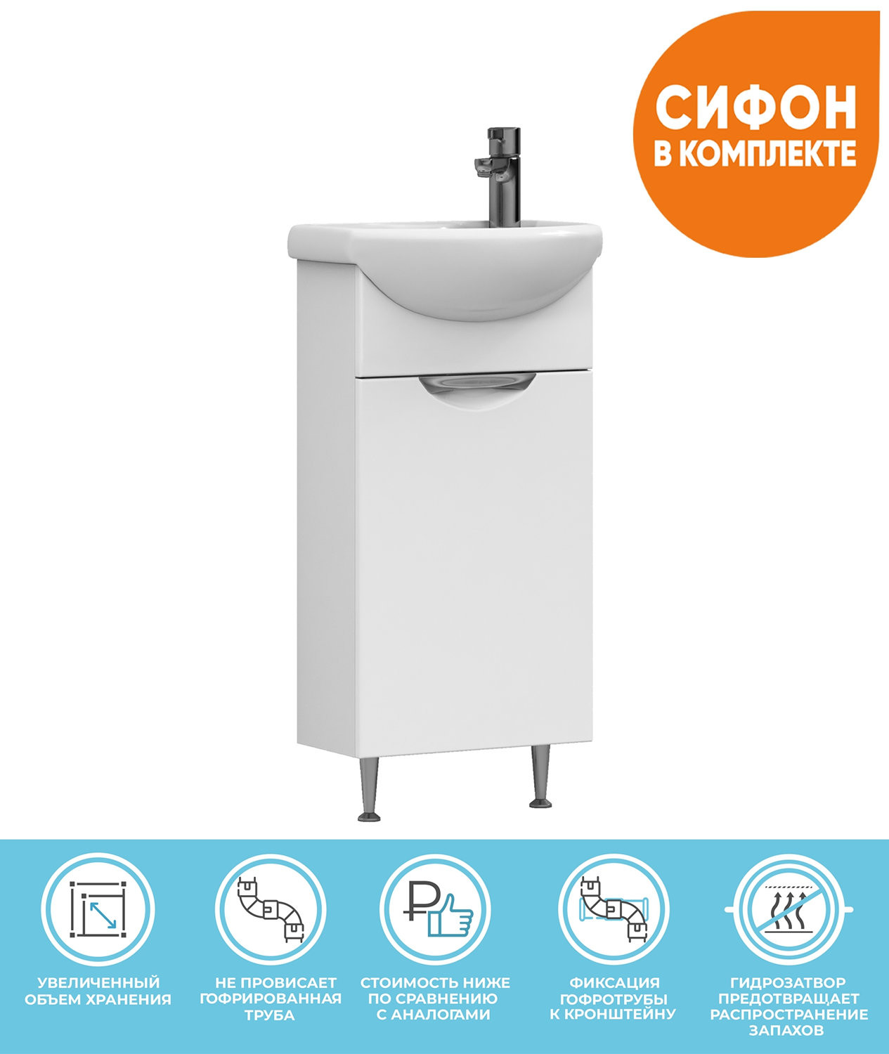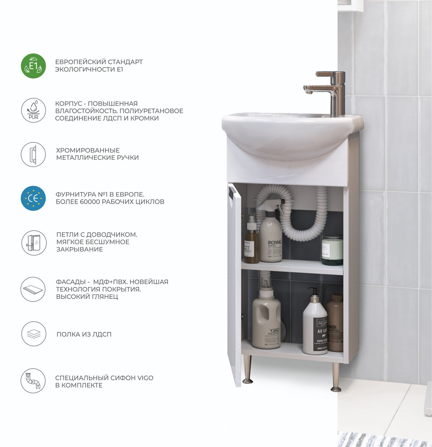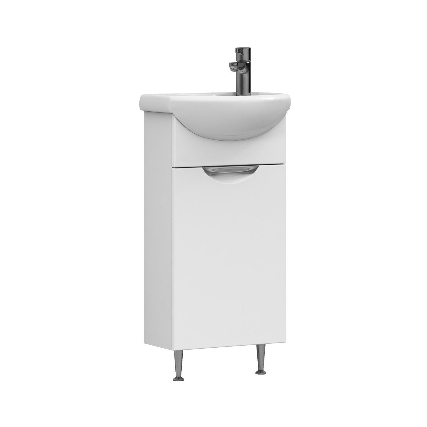 Тумба с раковиной напольная VIGO Callao tn.CAL.NEO.40.1D, 40 см. Раковина в комплекте. 1 дверца; 1 полка ЛДСП; ручка металлическая хромированная; опоры конус регулируемые. Материал корпуса: влагостойкая ЛДСП Материал фасадов: ЛМДФ Покрытие: пленка ПВХ Дверцы: петли с механизмом плавного закрывания..