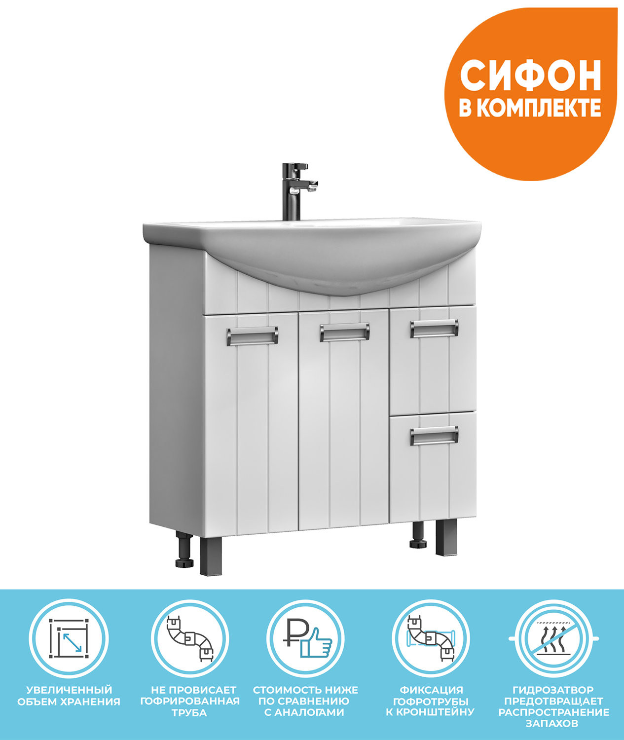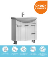 Тумба с раковиной напольная VIGO Diana tn.DIA.BAL.80.2D.2Y, 80 см. Раковина в комплекте. 2 дверцы; 2 ящика; 1 полка ЛДСП; ручка металлическая хромированная; опоры квадратные регулируемые. Специальный сифон Vigo в комплекте. Материал корпуса: влагостойкая ЛДСП Материал фасадов: ЛМДФ Покрытие: пленка ПВХ Дверцы: петли с механизмом плавного закрывания Ящики: направляющие полного выдвижения..