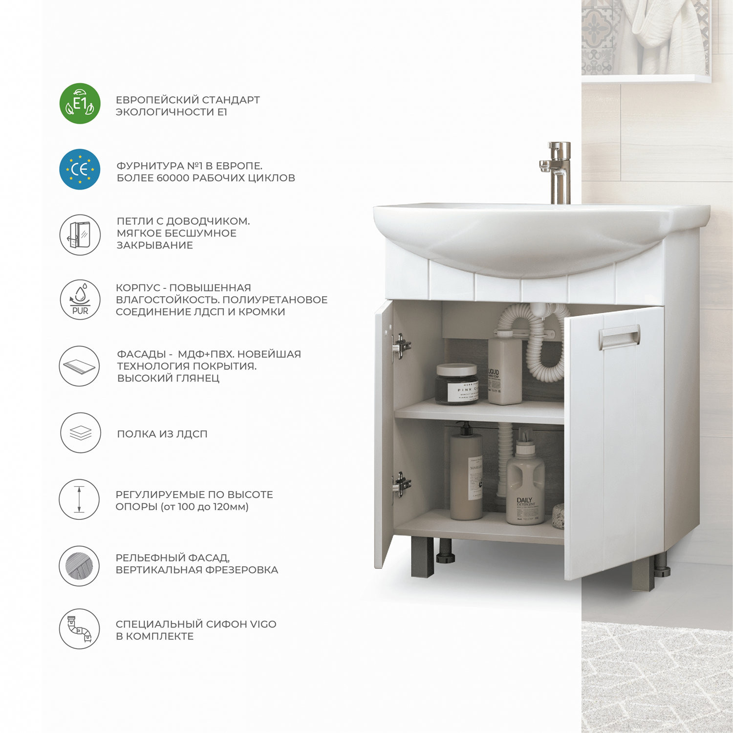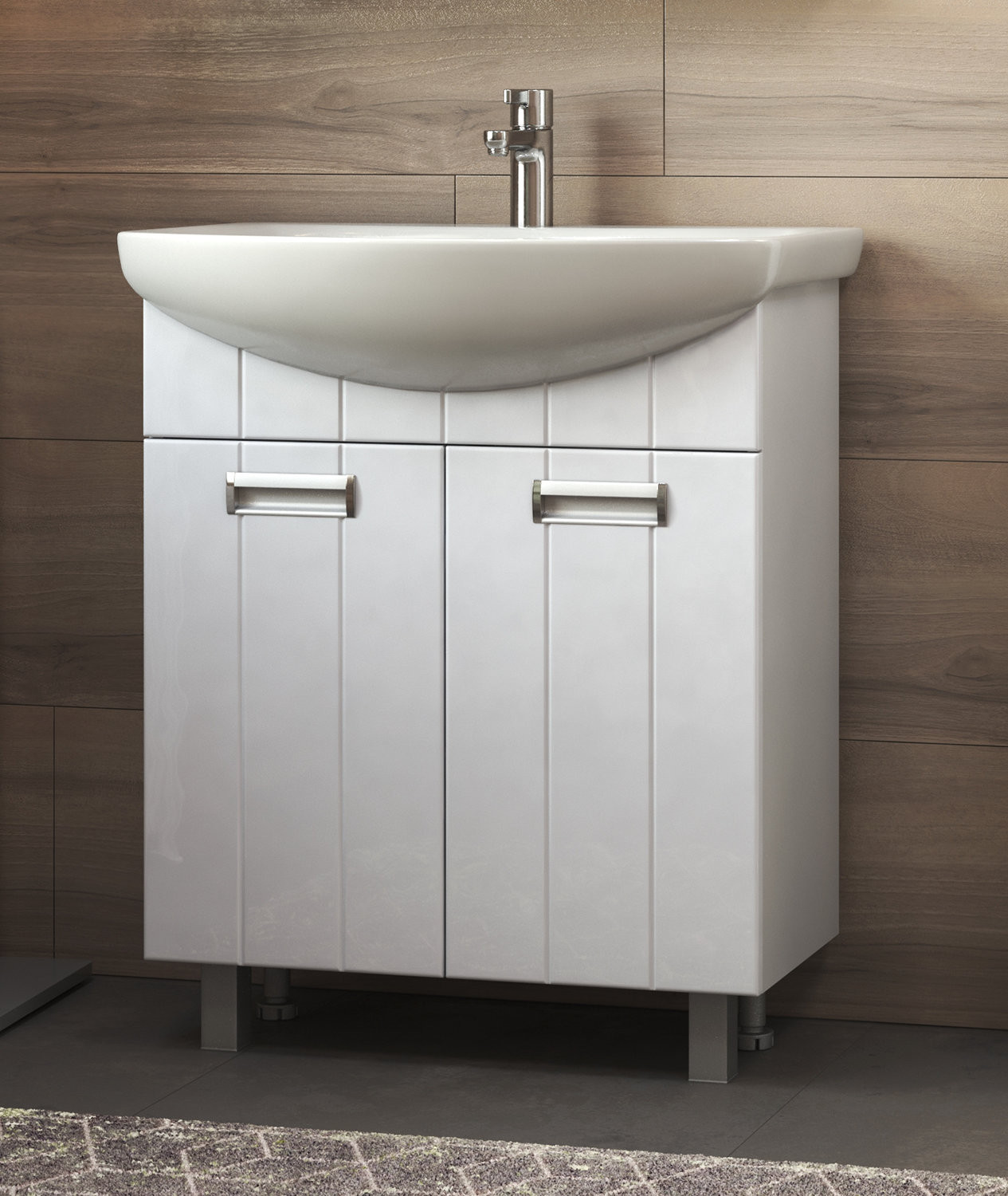 Тумба с раковиной напольная VIGO Diana tn.DIA.PAL.70.2D, 70 см. Раковина в комплекте. 2 дверцы; 1 полка ЛДСП; ручка врезная металлическая хромированная, опоры квадратные регулируемые. Специальный сифон Vigo в комплекте. Материал корпуса: влагостойкая ЛДСП Материал фасадов: ЛМДФ Покрытие: пленка ПВХ Дверцы: петли с механизмом плавного закрывания Ящики: направляющие полного выдвижения..