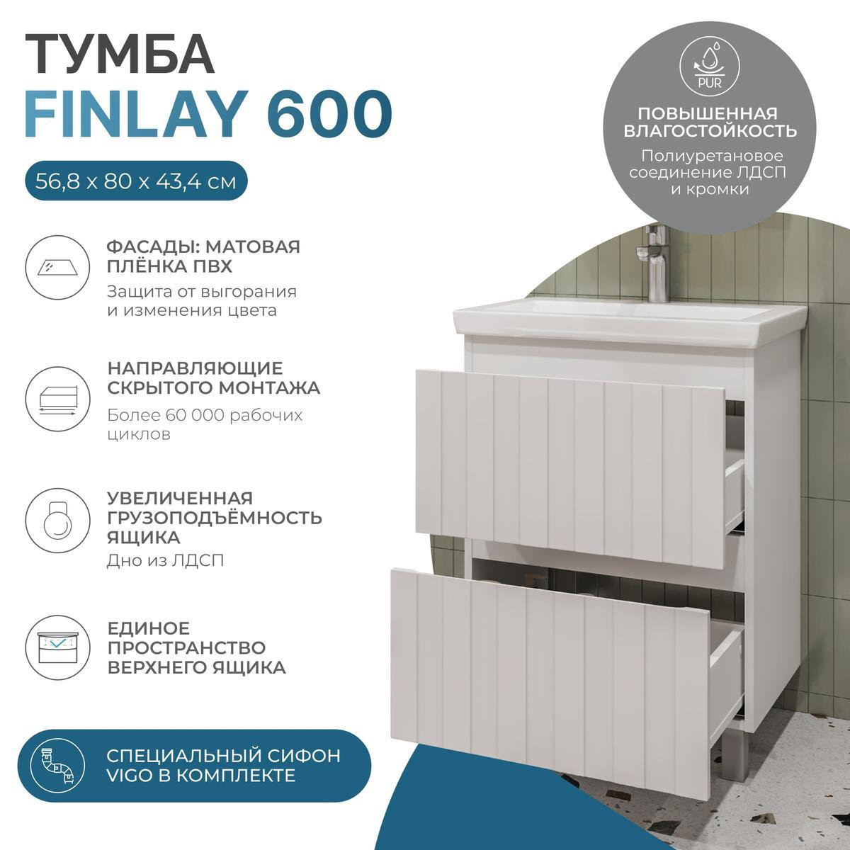 Тумба с раковиной напольная VIGO Finlay tn.FIN.COM.60.2Y, 60 см. Раковина в комплекте. Гарантийный срок 2 года. Монтаж: напольный. Доводчик: да. Нажимной механизм: нет..