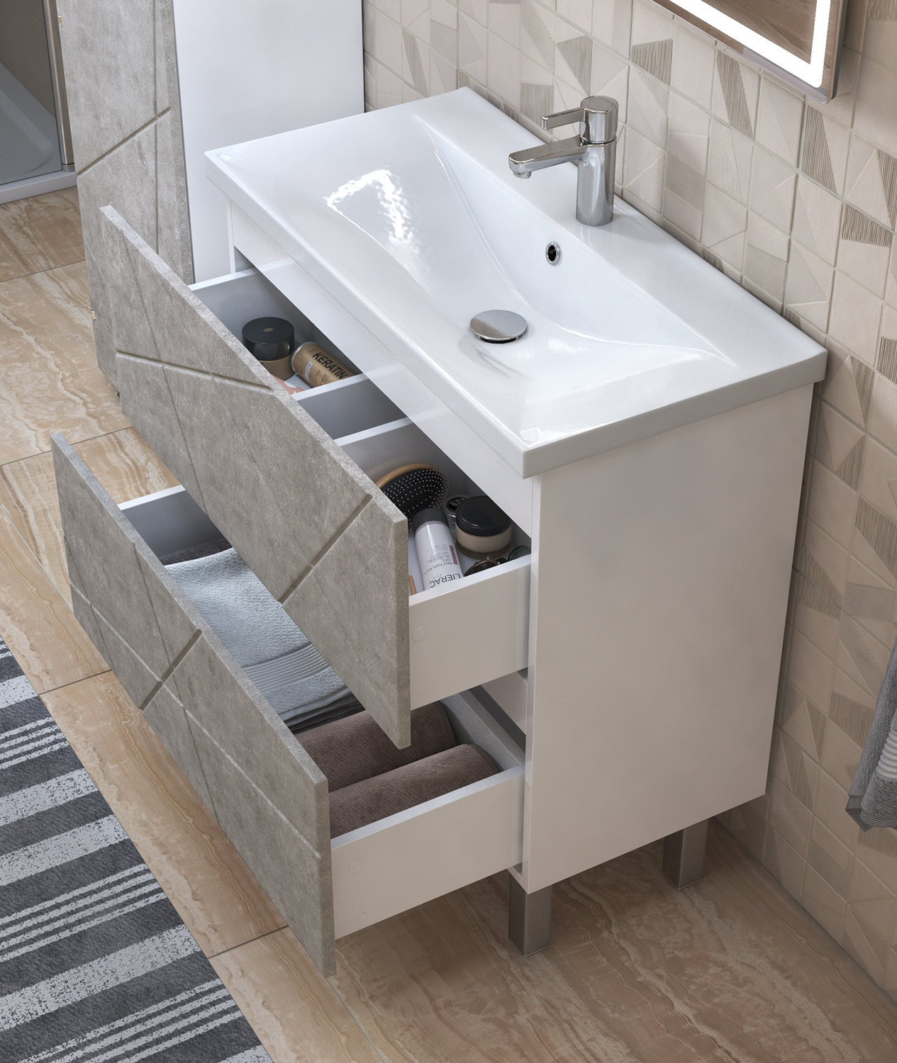 Тумба с раковиной напольная VIGO Geometry tn.bsf.GEO.9696.80.2Y бетон, 80 см. Раковина в комплекте. 2 ящика; опоры квадратные регулируемые. Специальный сифон Vigo в комплекте. Материл корпуса тумбы: влагостойкая ЛДСП Материал фасадов: МДФ Покрытие: пленка ПВХ Ящики: направляющие полного выдвижения, механизм push-to-open.