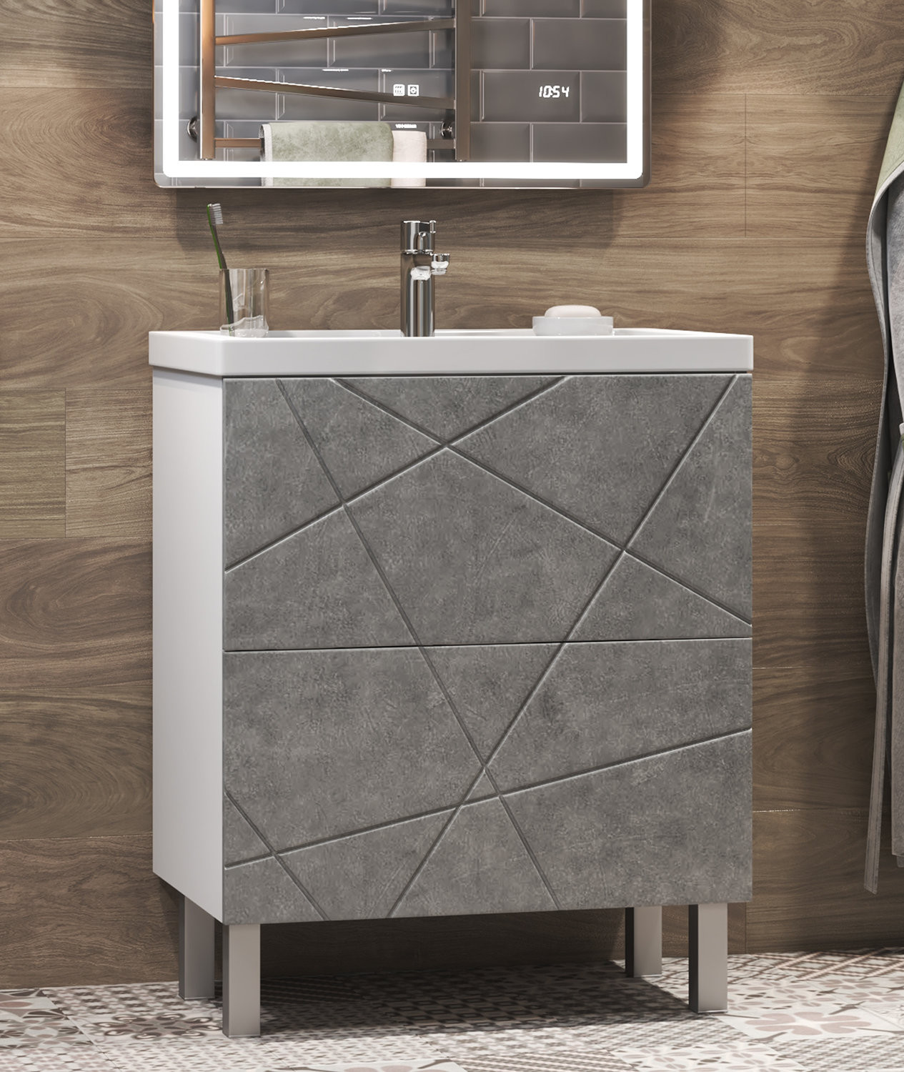 Тумба с раковиной напольная VIGO Geometry tn.bsf.GEO.COM.60.2Y бетон, 60 см. Раковина в комплекте. 2 ящика; опоры квадратные регулируемые. Специальный сифон Vigo в комплекте. Материл корпуса тумбы: влагостойкая ЛДСП Материал фасадов: МДФ Покрытие: пленка ПВХ Ящики: направляющие полного выдвижения, механизм push-to-open.
