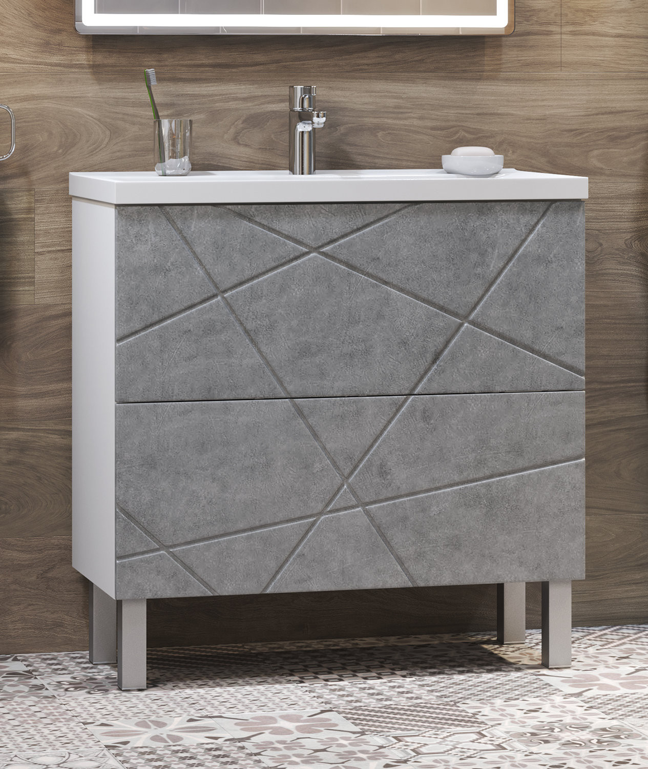 Тумба с раковиной напольная VIGO Geometry tn.GEO.9696.80.2Y бетон, 80 см. Раковина в комплекте. 2 ящика; опоры квадратные регулируемые. Специальный сифон Vigo в комплекте. Материл корпуса тумбы: влагостойкая ЛДСП Материал фасадов: МДФ Покрытие: пленка ПВХ Ящики: направляющие полного выдвижения, механизм push-to-open.