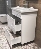 Тумба с раковиной напольная VIGO Geometry tn.GEO.FOS.50.2Y, 50 см. Раковина в комплекте. 2 ящика; опоры квадратные регулируемые. Специальный сифон Vigo в комплекте. Материл корпуса тумбы: влагостойкая ЛДСП Материал фасадов: МДФ Покрытие: пленка ПВХ Ящики: направляющие полного выдвижения, механизм push-to-open.