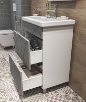 Тумба с раковиной напольная VIGO Geometry tn.GEO.FOS.60.2Y бетон, 60 см. Раковина в комплекте. 2 ящика; опоры квадратные регулируемые. Специальный сифон Vigo в комплекте. Материл корпуса тумбы: влагостойкая ЛДСП Материал фасадов: МДФ Покрытие: пленка ПВХ Ящики: направляющие полного выдвижения, механизм push-to-open.