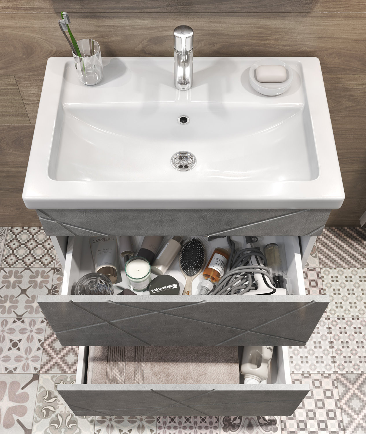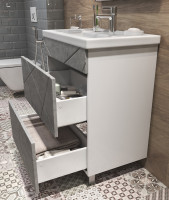 Тумба с раковиной напольная VIGO Geometry tn.GEO.FOS.70.2Y бетон, 70 см. Раковина в комплекте. 2 ящика; опоры квадратные регулируемые. Специальный сифон Vigo в комплекте. Материл корпуса тумбы: влагостойкая ЛДСП Материал фасадов: МДФ Покрытие: пленка ПВХ Ящики: направляющие полного выдвижения, механизм push-to-open.
