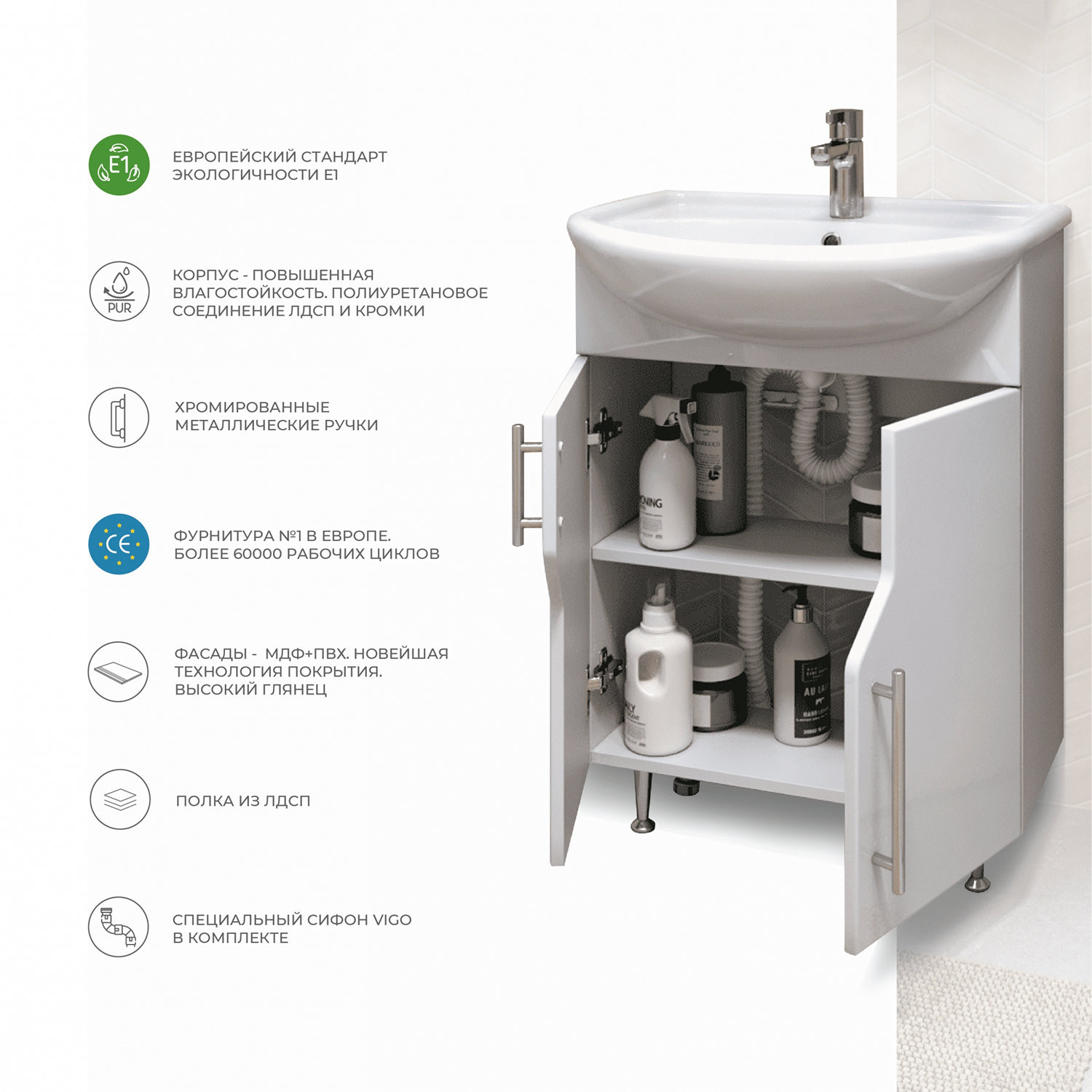 Тумба с раковиной напольная VIGO Grand tn.GRA.BAL.55.2D, 55 см. Раковина в комплекте. 2 дверцы; 1 полка ЛДСП; опоры конус регулируемые. Специальный сифон Vigo в комплекте. Материал корпуса: влагостойкая ЛДСП Материал фасадов: ЛМДФ Покрытие: пленка ПВХ..