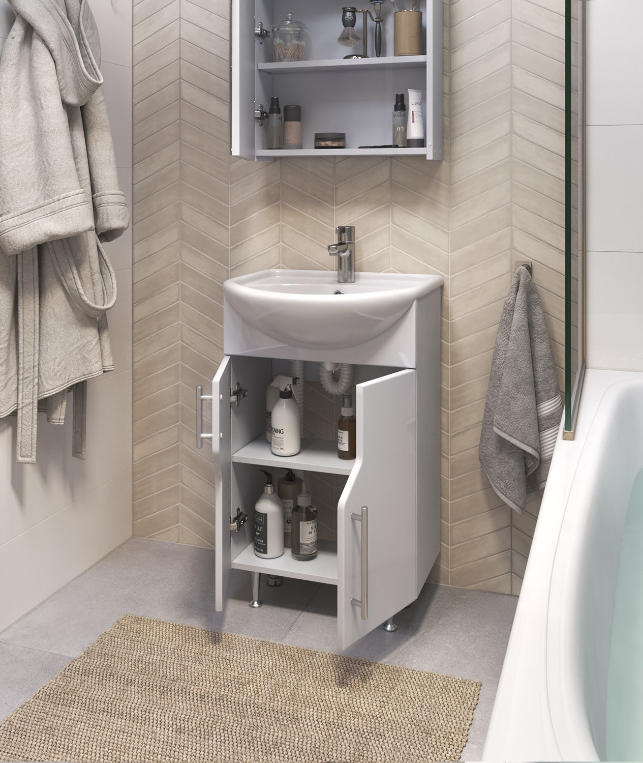 Тумба с раковиной напольная VIGO Grand tn.GRA.UYU.50.2D, 50 см. Раковина в комплекте. 2 дверцы; 1 полка ЛДСП; опоры конус регулируемые. Специальный сифон Vigo в комплекте. Материал корпуса: влагостойкая ЛДСП Материал фасадов: ЛМДФ Покрытие: пленка ПВХ..